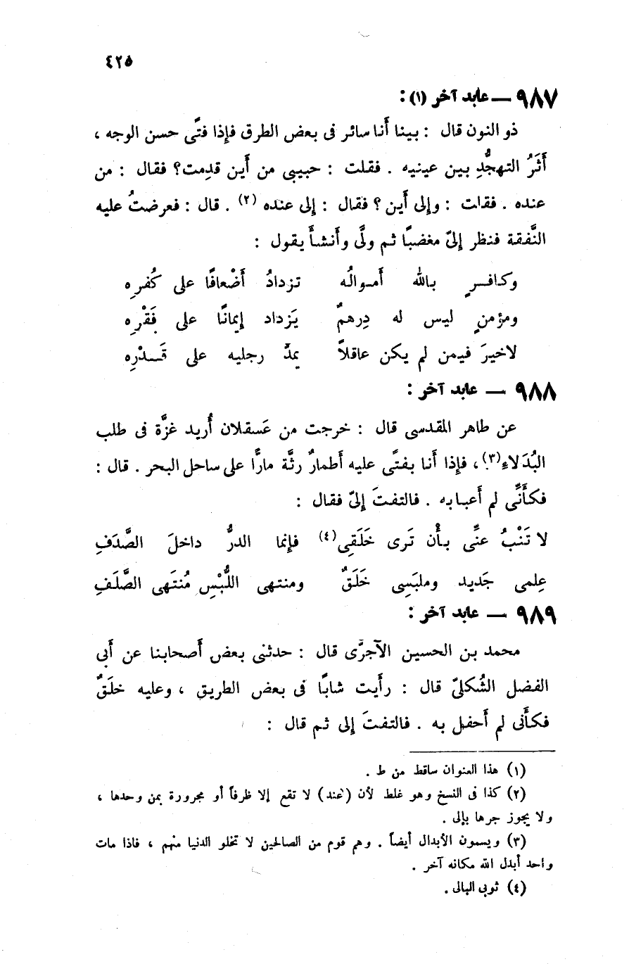 محمد بن الحسين الآجرى قال حدثني بعض أصحابنا عن أبي الفضل الشكلى قال رأيت شابا في بعض الطريق وعليه خلق فكأنى لم أحفل به فالتفت إلى ثم قال