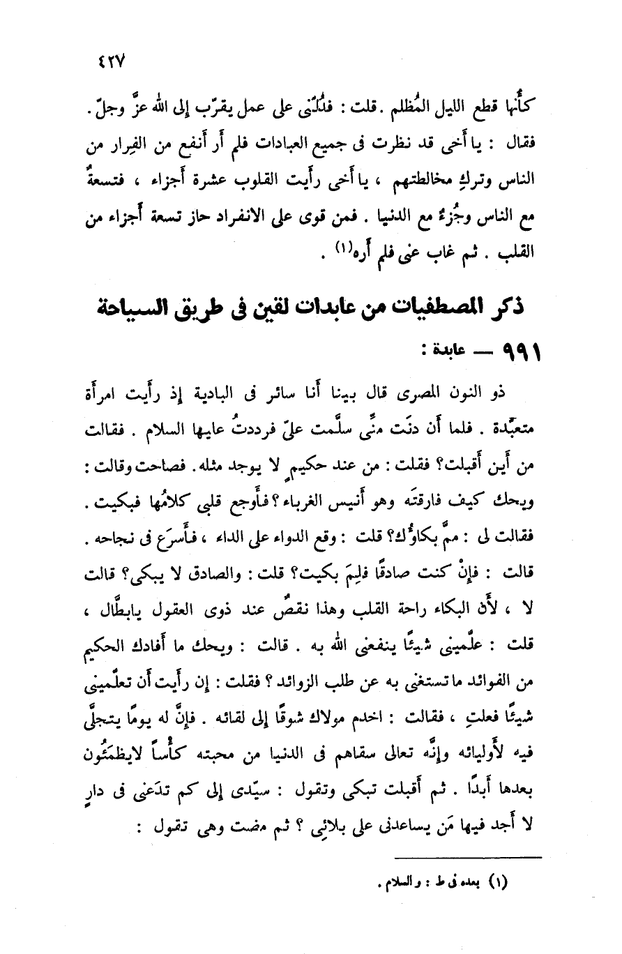 ذو النون المصري قال بينا أنا سائر في البادية إذ رايت امرأة متعبدة فلما أن دنت مني سلمت على فرددت عليها السلام فقالت من أين أقبلت فقلت من عند حكيم لا يوجد مثله فصاحت وقالت ويحك كيف فارقته وهو أنيس الغرباء فأوجع قلبي كلامها فبكيت فقالت لي مم بكاؤك قلت وقع الدواء على الداء فأسرع في نجاحه قالت فإن كنت صادقا فلم بكيت قلت والصادق لا يبكى قالت لا لأن البكاء راحة القلب وهذا نقص عند ذوي العقول با بطال قلت علمني شيئا ينفعني الله به قالت ويحك ما أفادك الحكيم من الفوائد ما تستغني به عن طلب الزوائد فقلت إن رأيت أن تعلميني شيئا فعلت فقالت اخدم مولاك شوقا إلى لقائه فإن له يوما يتجلى فيه لأوليائه وإنه تعالى سقاهم في الدنيا من محبته كأسا لا يظمئون بعدها أبدا ثم أقبلت تبكي وتقول سيدي إلى كم تدعنى في دار لا أجد فيها من يساعدني على بلائي ثم مضت وهي تقول