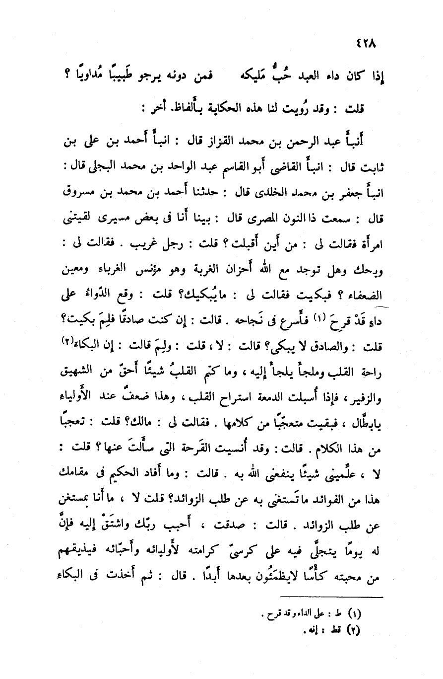 أنبأ عبد الرحمن بن محمد القزاز قال أنبأ أحمد بن علي بن ثابت قال انبأ القاضي أبو القاسم عبد الواحد بن محمد البجلي قال أنبأ جعفر بن محمد الخلدي قال حدثنا أحمد بن محمد بن مسروق قال سمعت ذا النون المصري قال بينا أنا في بعض مسيري لقيتني امرأة فقالت لي من أين أقبلت قلت رجل غريب فقالت لي ويحك وهي توجد مع الله أحزان الغربة وهو مؤنس الغرباء ومعين الضعفاء فبكيت فقالت لي ما يبكيك قلت وقع الدواء على داء قد قرح فاسرع في نجاحه قالت إن كنت صادقا فلم بكيت قلت والصادق لا يبكي قالت لا قلت ولم قالت إن البكاء راحة القلب وملجأ يلجأ إليه وما كتم القلب شيئا أحق من الشهيق والزفير فإذا أسبلت الدمعة استراح القلب وهذا ضعف عند الأولياء يأبطال فبقيت متعجبا من كلامها فقالت لي مالك قلت تعجبا من هذا الكلام قالت وقد أنسيت القرحة التي سألت عنها قلت لا علميني شيئا ينفعني الله به قالت وما أفاد الحكيم في مقامك هذا من الفوائد ما تستغني به عن طلب الزوائد قلت لا ما أنا بمستغن عن طلب الزوائد قالت صدقت أحبب ربك واشتق إليه فإن له يوما يتجلى فيه على كرسي كرامته لأوليائه واحبائه فيذيقهم من محبته كأسا لا يظمئون بعدها أبدا قال ثم أخذت في البكاء