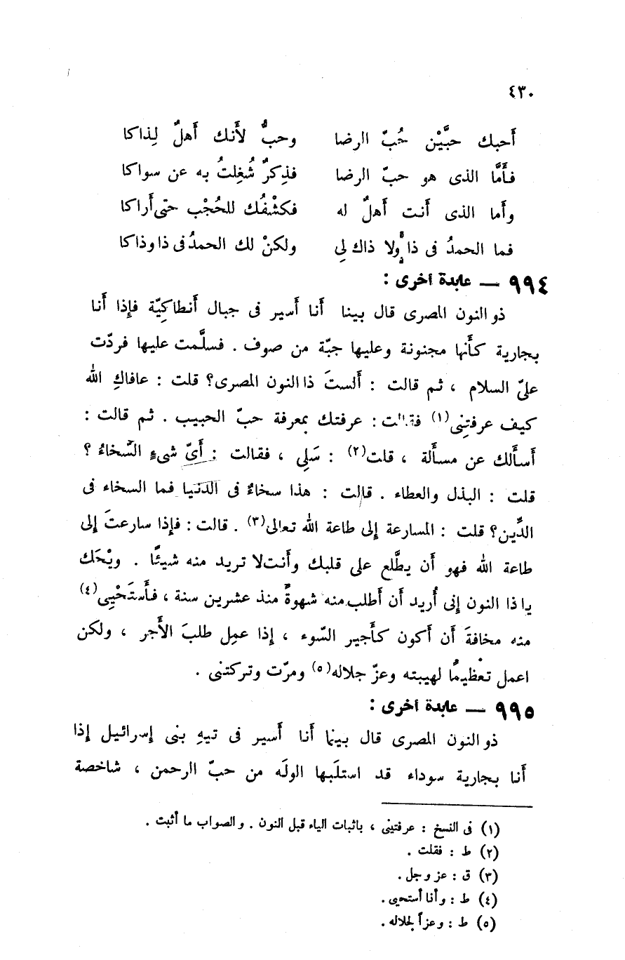 ذو النون المصري قال بينما أنا أسير في تيه بني إسرائيل إذا أنا بجارية سوداء قد استلبها الولة من حب الرحمن شاخصة