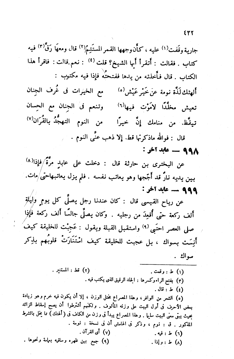 عن رياح القيسي قال كان عندنا رجل يصلى كل يوم وليلة الف ركعة حتىاقعد من رجليه وكان يصلى جالسا ألف ركعة فإذا صلى العصر احتبى واستقبل القبلة ويقول عجبت للخليقة كيف أنست بسواك بل عجبت للخليقة كيف استنارت قلوبهم بذكر سواك