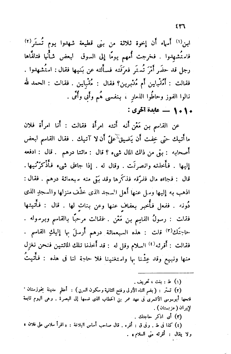 عن القاسم بن معن أنه أتته امرأة فقالت أنا امرأة فلان ما أتيك حتى خفت أن يضيق علي أن لا آتيك فقال القاسم لبعض أصحابه بقى من ذلك المال شيء قال مائتا درهم قال ادفعه إليها فأخذته وانصرفت وقال له إذا جاءني شيء فأذكرنيها ثال فجاءه مال ففرقه فذكرها وقد بقى منه سبعمائة درهم فقال اذهب به إليها وسل عنه أهل المسجد الذي خلف منزلها والمسجد الذي دونه ففعل فأخبر بعفاف عنها وعن بنات لها قال فأتيتها فقلت رسول القاسم بن معن فقالت مرحبا بالقاسم وبرسوله حاجتك قلت هذه السبعمائة درهم أرسل بها إليك القاسم فقالت أقرئه السلام وقل له قد أخذنا تلك المائتين فنحن نغزل منها ونبيع وقد عشنا بها واستفنينا فلا حاجة لنا في هذه فأتيت