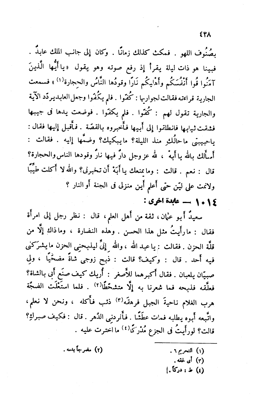 بصنوف اللهو و فمكث كذلك زمانا وكان إلى جانب الملك عابد فبينا هو ذات ليلة يقرأ إذ رفع صوته وهو يقول يا أيها الذين آمنوا قوا أنفسكم وأهليكم نارا وقودها الناس و الحجارة فسمعت الجارية قراءته فقالت لجواريها كفوا فلم يكفوا وجعل العابد يردد الآية والجارية تقول لهم كفوا فلم يكفوا فوضعت يدها في جيبها فشقت ثيابها فانطلقوا إلى أبيها فأخبروه بالقصة فأقبل إليها فقال يا حبيبتي ما حالك منذ الليلة ما يبكيك وضمها إليه فقالت أسالك بالله يا أبه لله عز و جل دار فيها نار وقودها الناس والحجارة قال نعم قالت وما يمنعك يا أبه أن تخبرني والله لا أكلت طيبا ولا نمت على لين حتى أعلم أين منزلي في الجنة أو النار