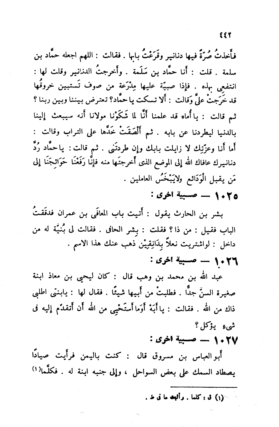 فأخذت صرة فيها دنانير وقرعت بابها فقالت اللهم اجعله حماد بن سلمة قلت أنا حماد بن سلمة وأخرجت الدنانير وقلت لها انتفعى بهذه فإذ صبية عليها مدرعة من صوف تستبين خروقها قد خرجت على وقالت ألا تسكت يا حماد تعترض بيننا وبين ربنا ثم قالت يا أماه قد علمنا أنا لما شكونا مولانا أنه سيبعث إلينا بالدنيا ليطردنا عن بابه ثم ألصقت خدها على التراب وقالت أما أنا وعزتك لا زايلت بابك وإن طردتني ثم قالت يا حماد رد دنانيرك عافاك الله إلى الموضع الذي أخرجتها منه فإنا رفعنا حوائجنا إلى من يقبل الودائع ولا يبخس العاملين