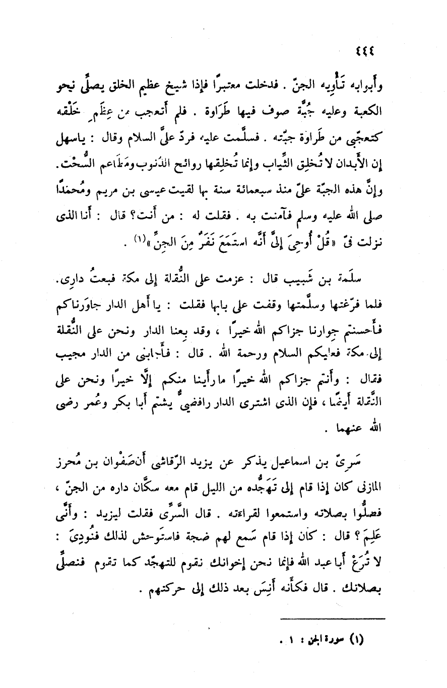 وأبوابه تأويه الجن فدخلت معتبرا فإذا شيخ عظيم الخلق يصلى نحو الكعبة وعليه جبة صوف فيها طراوة فلم أتعجب من عظم خلقه كتعجبى من طراوة جبته فسلمت عليه فرد على السلام وقال يا سهل إن الأبدان لا تخلق الثياب وإنما تخلقها روائح الذنوب ومطاعم السحت وإن هذه الجبة علي منذ سبعمائة سنة بها لقيت عيسى بن مريم ومحمدا صلى الله عليه و سلم فآمنت به فقلت له من أنت قال أنا الذي نزلت في قل أوحى إلي أنه استمع نفر من الجن