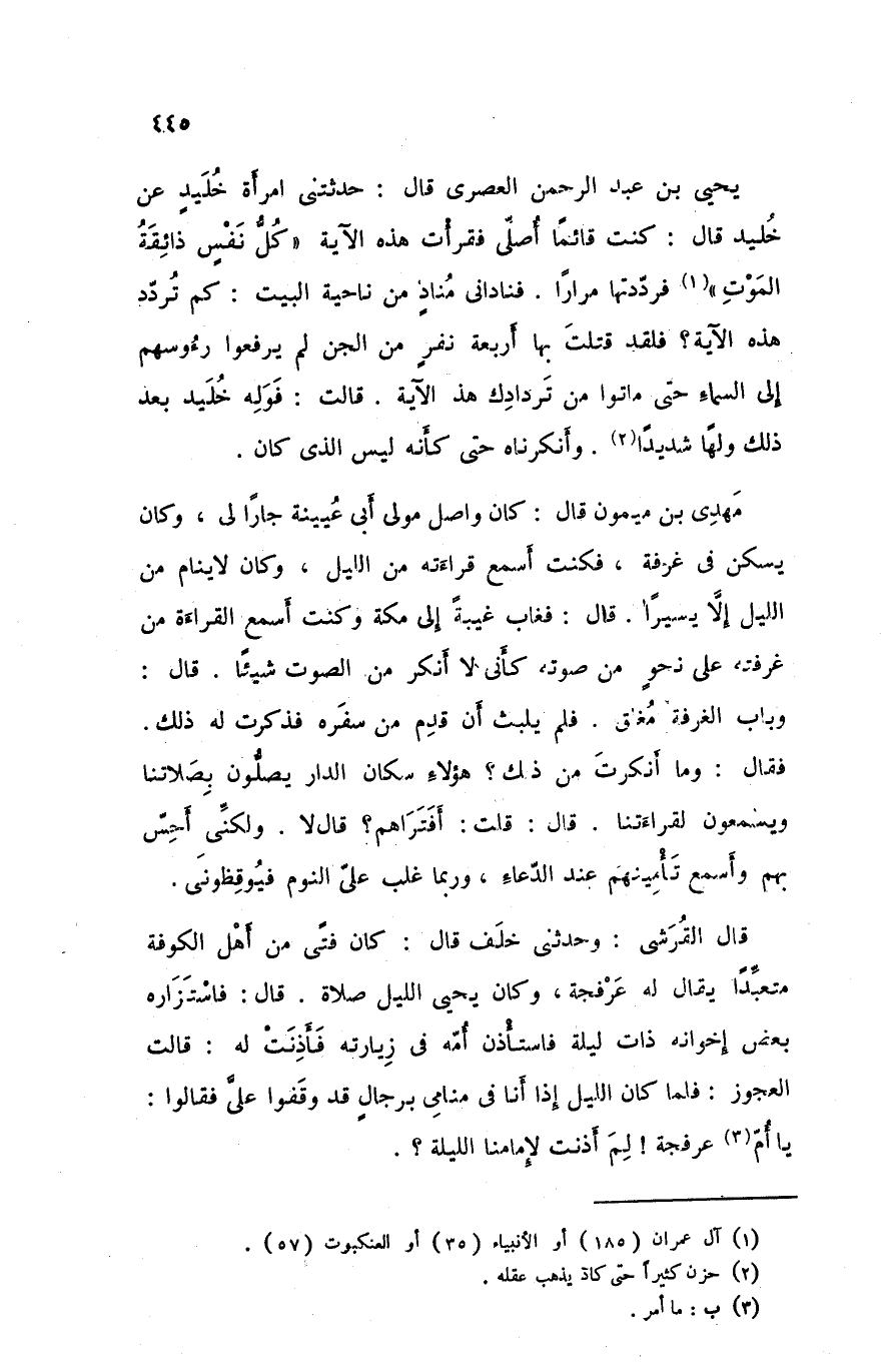 يحيى بن عبدالرحمن العصرى قال حدثتني امرأة خليد عن خليد قلا كنت قائما أصلى فقرأت هذه الآية كل نفس ذائقة الموت فرددتها مرارا فناداني مناد من ناحية البيت كم تردد هذه الآية فلقد قتلت بها أربعة نفر من الجن لم يرفعوا رؤوسهم إلى السماء حتى ماتوا من تردادك هذه الآية قالت فوله خليد بعد ذلك ولها شديدا وأنكرناه حتى كأنه ليس الذي كان