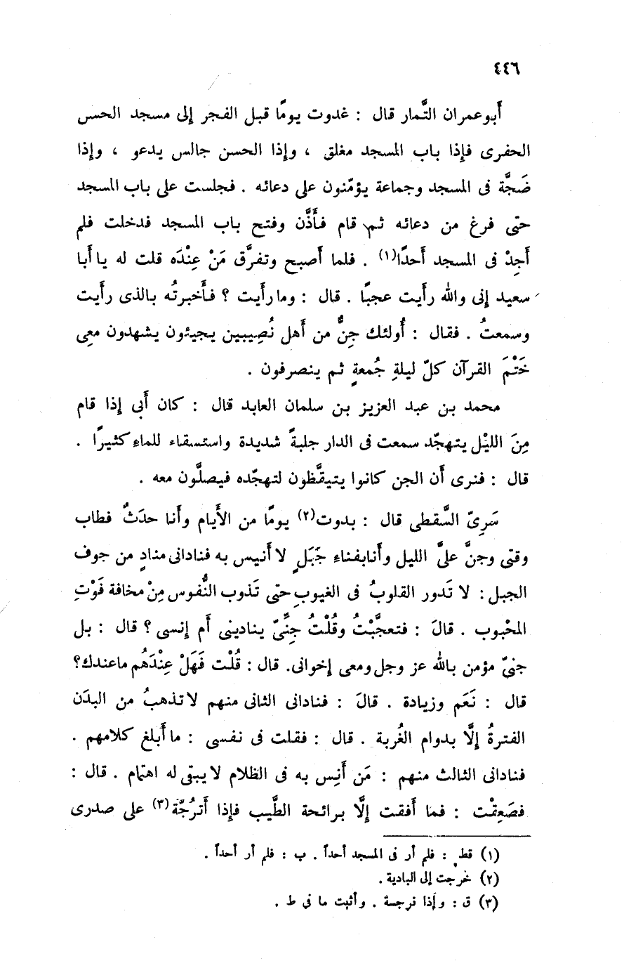 أبو عمران التمار قال غدوت يوما قبل الفجر إلى مسجد الحسن الحفرى فإذا باب المسجد مغلق وإذا الحسن جالس يدعو وإذا ضجة في المسجد وجماعة يؤمنون على دعائه فجلست على باب المسجد حتى فرغ من دعائه ثم قام فأذن وفتح باب المسجد فدخلت فلم أجد في المسجد أحدا فلما أصبح وتفرق من عنده قلت له يا أبا سعيد إني والله رأيت عجبا قال وما رأيت فأخبرته بالذي رأيت وسمعت فقال أولئك جن من أهل نصيبين يجيئون يشهدون معي ختم القرآن كل ليلة جمعة ثم ينصرفون