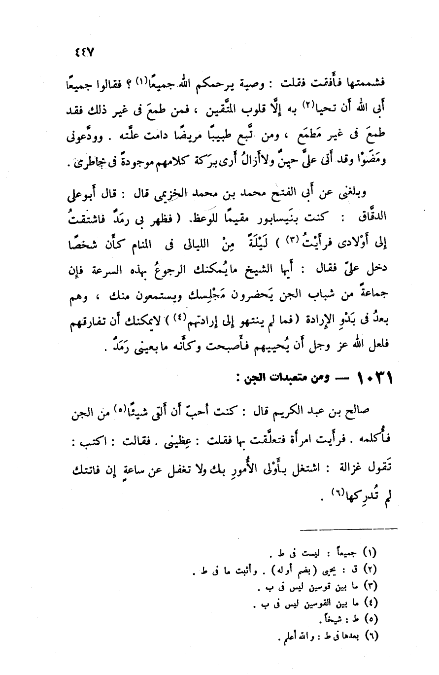 صالح بن عبد الكريم قال كنت أحب أن ألقى شيئا من الجن فأكلمه فرايت امرأة فتعلقت بها فقلت عظيني فقالت اكتب تقول غزالة اشتغل بأولى الأمور بك ولا تغفل عن ساعة إن فاتتك لم تدركها