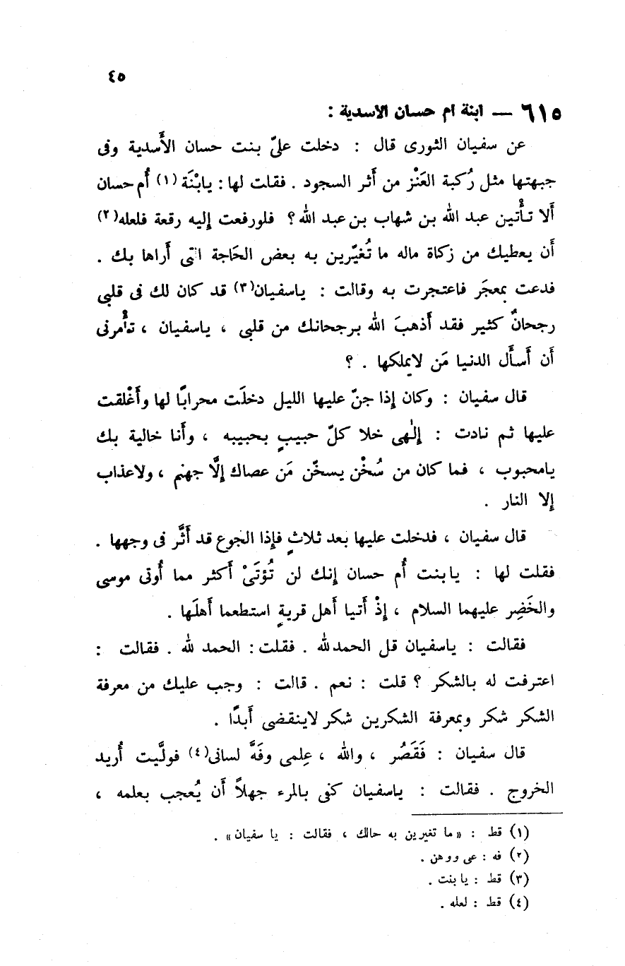 عن سفيان الثوري قال دخلت علي بنت حسان الأسدية وفي جبهتها مثل ركبة العنز من أثر السجود فقلت لها يا بنة أم حسان الا تاتين عبد الله بن شهاب بن عبد الله فلو رفعت إليه رقعة فلعله أن يعطيك من زكاة ماله ما تغيرين به بعض الحاجة التي أراها بك فدعت بمعجر فاعتجرت به وقالت يا سفيان قد كان لك في قلبي رجحان كثير فقد اذهب الله برجحانك من قلبي يا سفيان تامني أن اسال الدنيا من لا يملكها