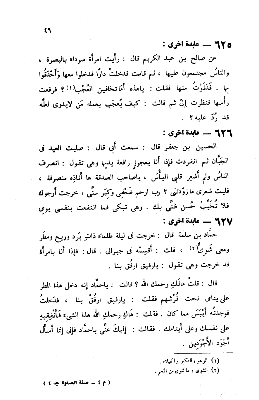 عن صالح بن عبد الكريم قال رأيت امراة سوداء بالبصرة والناس مجتمعون عليها ثم قامت فدخلت دارا فدخلوا معها وأحدقوا بها فدنوت منها فقلت يا هذه أما تخافين العجب فرفعت رأسها فنظرت إلي ثم قالت كيف يعجب بعمله من لا يدري لعله قد رد عليه
