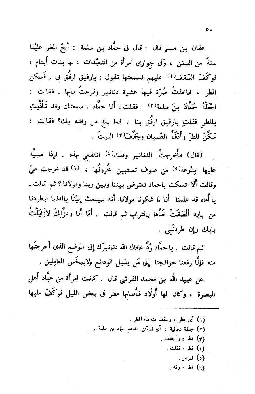 عفان بن مسلم قال قال لي حماد بن سلمة الح المطر علينا سنة من السنن وفي جواري امرأة من المتعبدات لها بنات أيتام فوكف السقف عليهم فسمعتها تقول يا رفيق ارفق بي فسكن المطر فأخذت صرة فيها عشرة دنانير وقرعت بابها فقالت اجعله حماد بن سلمة فقلت أنا حماد سمعتك وقد تأذيت بالمطر فقلت يا رفيق ارفق بنا فما بلغ من رفقه بك فقالت سكن المطر وأدفأ الصبيان وجفف البيت