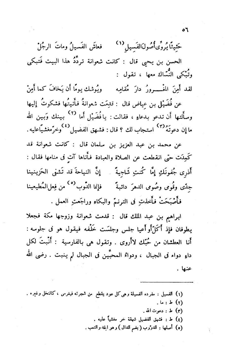 إبراهيم بن عبد الملك قال قدمت شعوانة وزوجها مكة فجعلا يطوفان فإذ أكل أو أعيا جلس وجلست خلفه فيقول هو في جلوسه أنا العطشان من حبك لا أروي وتقول هي بالفارسية أنبت لكل داء دواء في الجبال ودواء المحبين في الجبال لم ينبت رضي الله عنها