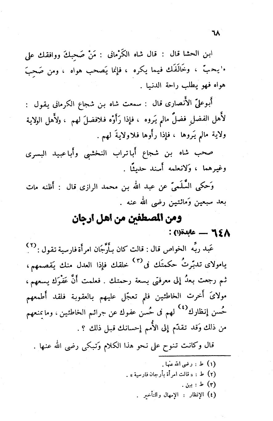 عبد ربة الخواص قال قالت كان بأرجان امرأة فارسية تقول يا مولاي تدبرت حكمتك في خلقك فإذا العدل منك يقصمهم ثم رجعت بعد إلى معرفتي بسعة رحمتك فعلعت أن عفوك يسعهم مولاي اخرت الخاطئين فلم تعجل عليهم بالعقوبة فلقد أطمعهم حسن إنظارك لهم في حسن عفوك عن جرائم الخاطئين وما يمنعهم من ذلك وقد تقدم إلى الأمم إحسانك قبل ذلك