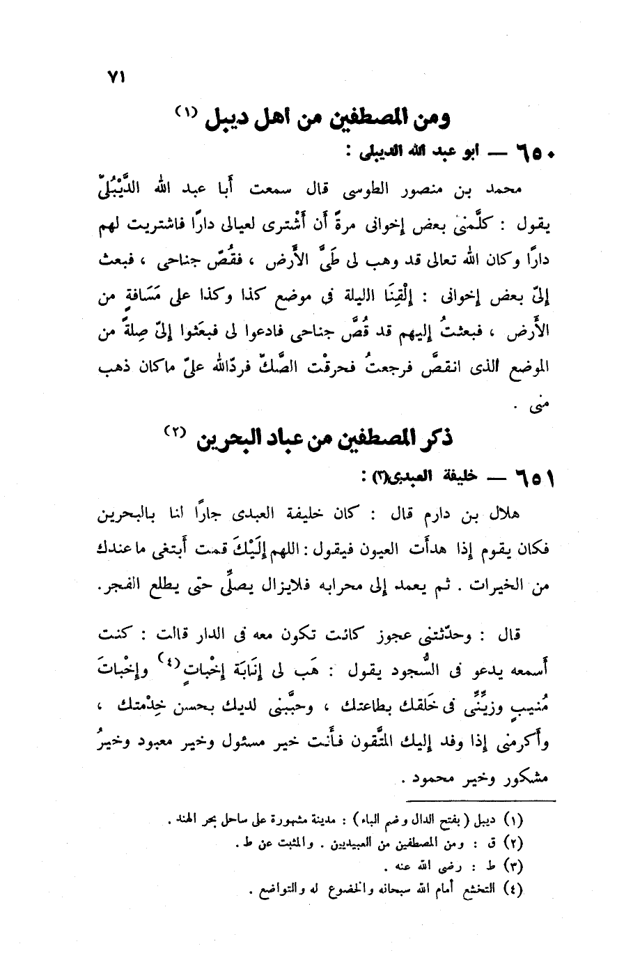 هلال بن دارم قال كان خليفة العبدي جارا لنا بالبحرين فكان يقوم إذا هدأت العيون فيقول اللهم إليك قمت أبتغي ما عندك من الخيرات ثم يعمد الى محرابه فلا يزال يصلي حتى يطلع الفجر
