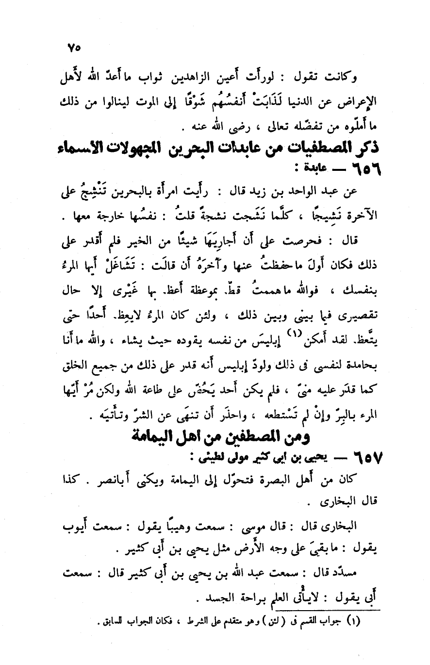 قال فحرصت على أن أجاريها شيئا من الخير فلم أقدر على ذلك فكان أول ما حفظت عنها وآخره أن قالت تشاغل أيها المرء بنفسك فوالله ما هممت قط بموعظة أعظ بها غيري إلا حال تقصيري فيما بيني وبين ذلك ولئن كان المرء لا يعظ أحدا حتى يتعظ لقد أمكن إبليس من نفسه يقوده حيث يشاء و الله ما أنا بحامدة لنفسي في ذلك ولود أبليس أنه قدر على ذلك من جميع الخلق كما قدر عليه مني فلم يكن أحد يحض على طاعة الله ولكن مر أيها المرء بالبر وإن لم تستطعه واحذر أن تنهى عن الشر وتأتية ومن المصطفين من أهل اليمامة