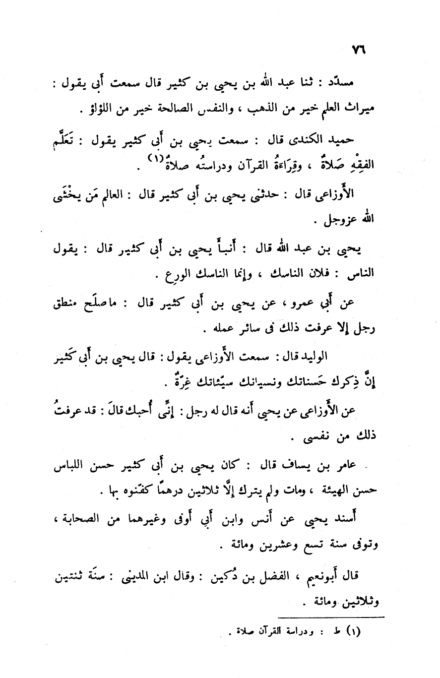 حميد الكندي قال سمعت يحيى بن ابي كثير يقول تعلم الفقه صلاة وقراءة القرآن ودراسته صلاة