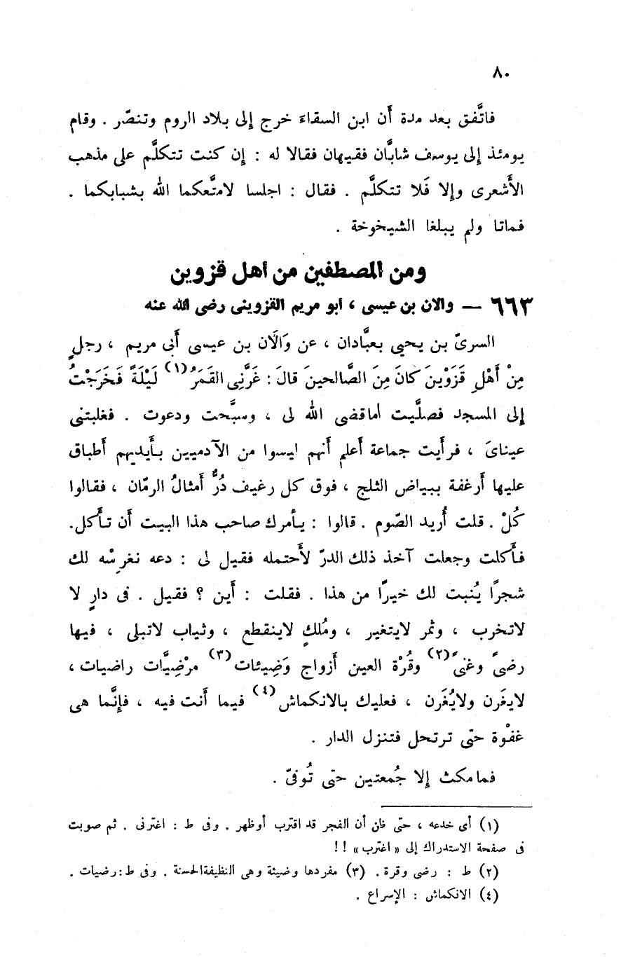 السري بن يحيى بعبادان عن والان بن عيسى أبي مريم رجل من أهل قزوين كان من الصالحين قال غرني القمر ليلة فخرجت إلى المسجد فصليت أما قضي الله لي وسبحت ودعوت فغلبتني عيناي فرأيت جماعة أعلم أنهم ليسوا من الآدميين بأيديهم أطباق عليها أرغفة ببياض الثلج فوق كل رغيف در أمثال الرمان فقالوا كل قلت أريد الصوم قالوا يأمرك صاحب هذا البيت أن تأكل فأكلت وجعلت آخذ ذلك الدر لأحتمله فقيل لي دعه نغرسه لك شجرا ينبت لك خيرا من هذا فقلت أين فقيل فى دار لا لاتخرب وثمرلا يتغير وملك لاينقطع وثياب لاتبلى فيها رضى وغنى وقرة العين أزواج وضيئات مرضيات راضيات لايغرن ولايغرن فعليك بالانكماش فيما أنت فيه فإنما هى غفوة حتى ترتحل فتنزل الدار