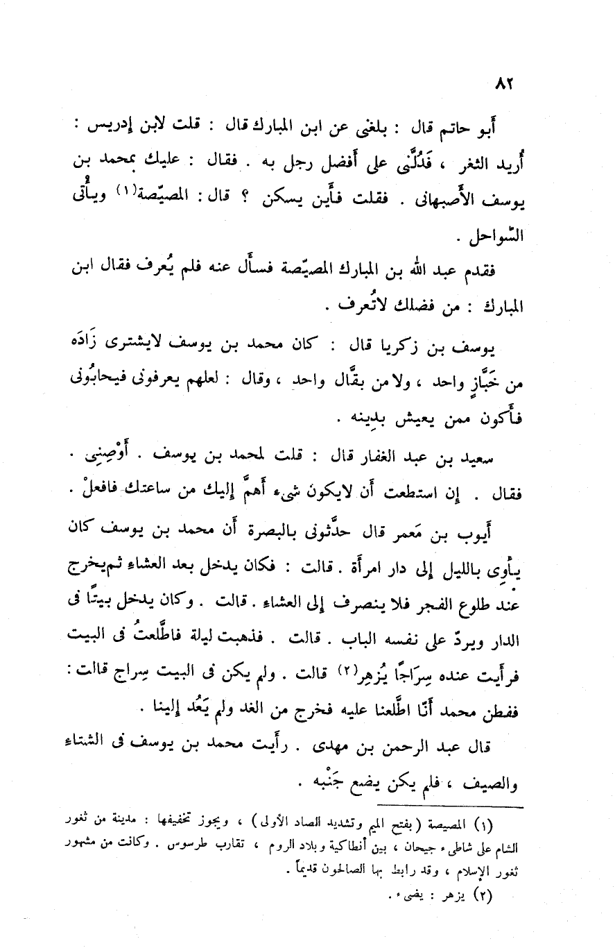 أبو حاتم قال بلغني عن ابن المبارك قال قلت لابن إدريس أريد الثغر فدلني على أفضل رجل به فقال عليك بمحمد بن يوسف الأصبهاني فقلت فأين يسكن قالالمصيصة ويأتي السواحل