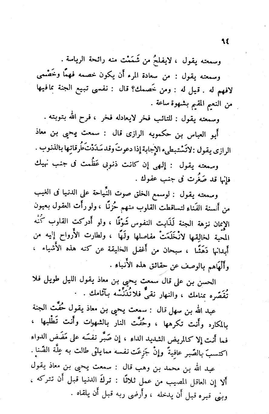 عبد الله بن محمد بن وهب قال سمعت يحيى بن معاذ يقول ألا إن العاقل المصيب من عمل ثلاثا ترك الدنيا قبل أن تتركه وبني قبره قبل أن يدخله و أرضى ربه قبل أن يلقاه
