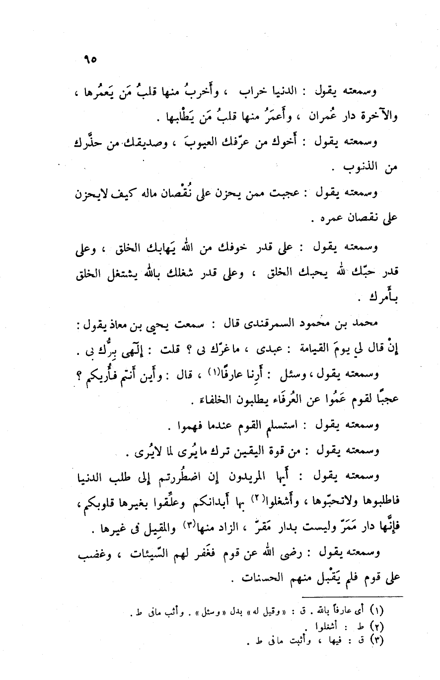 وسمعته يقول أيها المريدون إن اضررتم إلى طلب الدنيا فاطلبوها ولا تحبوها و أشغلوا بها أبدانكم و علقوا بغيرها قلوبكم فإنها دار ممر وليست بدار مقر الزاد منها و المقيل في غيرها