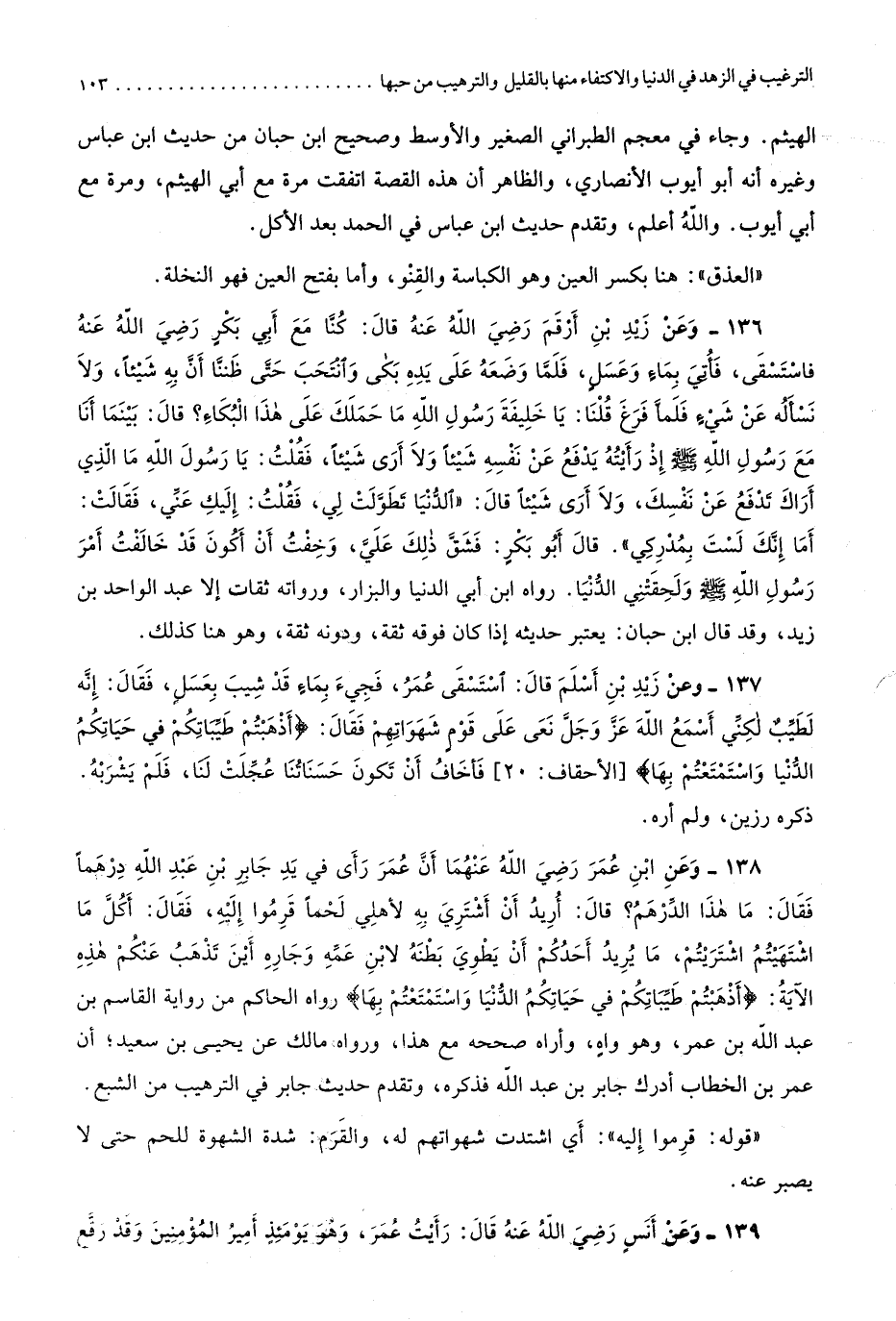 4991 - وَعَن زيد بن أسلم قَالَ استسقى عمر فجيء بِمَاء قد شيب بِعَسَل فَقَالَ إِنَّه لطيب لكني أسمع الله عز وَجل نعى على قوم شهواتهم فَقَالَ أَذهَبْتُم طَيِّبَاتكُمْ فِي حَيَاتكُم الدُّنْيَا وَاسْتَمْتَعْتُمْ بهَا الْأَحْقَاف 02 فَأَخَاف أَن تكون حَسَنَاتنَا عجلت لنا فَلم يشربه