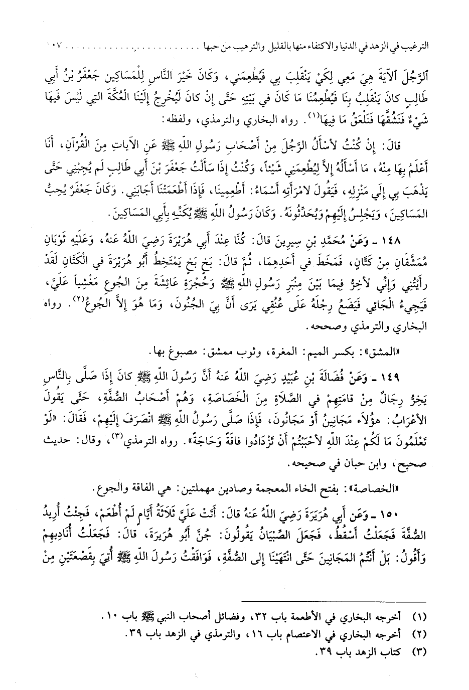 رَوَاهُ البُخَارِيّ وَالتِّرْمِذِيّ وَلَفظه قَالَ إِن كنت لأسأل الرجل من أَصْحَاب رَسُول الله صلى الله عَلَيْهِ وَسلم عَن الْآيَات من الْقُرْآن أَنا أعلم بهَا مِنْهُ مَا أسأله إِلَّا ليطعمني شَيْئا وَكنت إِذا سَأَلت جَعْفَر بن أبي طَالب لم يجبني حَتَّى يذهب بِي إِلَيّ منزله فَيَقُول لامْرَأَته أَسمَاء أطعمينا فَإِذا أطعمتنا أجابني