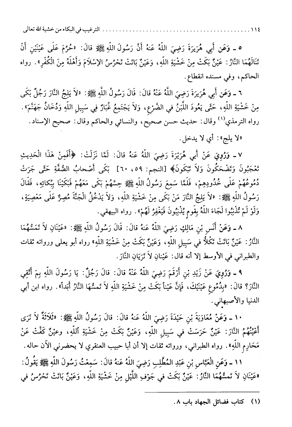 5030 - وَرُوِيَ عَن زيد بن أَرقم رَضِي الله عَنهُ قَالَ قَالَ رجل يَا رَسُول الله بِمَ أتقي النَّار قَالَ بدموع عَيْنَيْك فَإِن عينا بَكت من خشيَة الله لَا تمسها النَّار أبدا