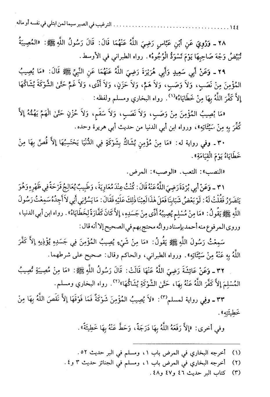 رَوَاهُ البُخَارِيّ وَمُسلم وَلَفظه مَا يُصِيب الْمُؤمن من وصب وَلَا نصب وَلَا سقم وَلَا حزن حَتَّى الْهم يهمه إِلَّا كفر بِهِ من سيئاته وَرَوَاهُ ابْن أبي الدُّنْيَا من حَدِيث أبي هُرَيْرَة وَحده