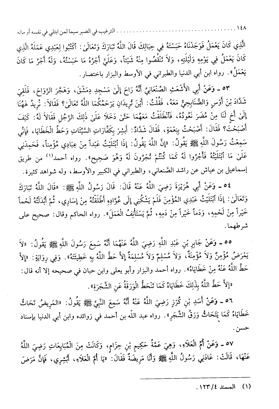 5195 - وَعَن أبي الْأَشْعَث الصَّنْعَانِيّ أَنه رَاح إِلَى مَسْجِد دمشق وهجر الرواح فلقي شَدَّاد بن أَوْس والصنابحي مَعَه فَقلت أَيْن تريدان يرحمكما الله تَعَالَى فَقَالَا نُرِيد هَهُنَا إِلَى أَخ لنا من مُضر نعوده فَانْطَلَقت مَعَهُمَا حَتَّى دخلا على ذَلِك الرجل فَقَالَا لَهُ كَيفَ أَصبَحت فَقَالَ أَصبَحت بِنِعْمَة فَقَالَ شَدَّاد أبشر بكفارات السَّيِّئَات وَحط الْخَطَايَا فَإِنِّي سَمِعت رَسُول الله صلى الله عَلَيْهِ وَسلم يَقُول إِن الله يَقُول إِذا ابْتليت عبدا من عبَادي مُؤمنا فحمدني على مَا ابتليته فأجروا لَهُ كَمَا كُنْتُم تجرون لَهُ وَهُوَ صَحِيح
