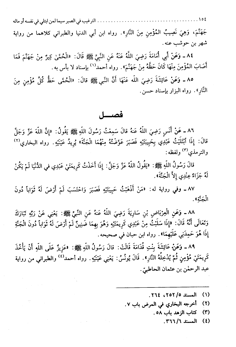 رَوَاهُ البُخَارِيّ وَالتِّرْمِذِيّ وَلَفظه قَالَ رَسُول الله صلى الله عَلَيْهِ وَسلم يَقُول الله عز وَجل إِذا أخذت كَرِيمَتي عَبدِي فِي الدُّنْيَا لم يكن لَهُ جَزَاء عِنْدِي إِلَّا الْجنَّة