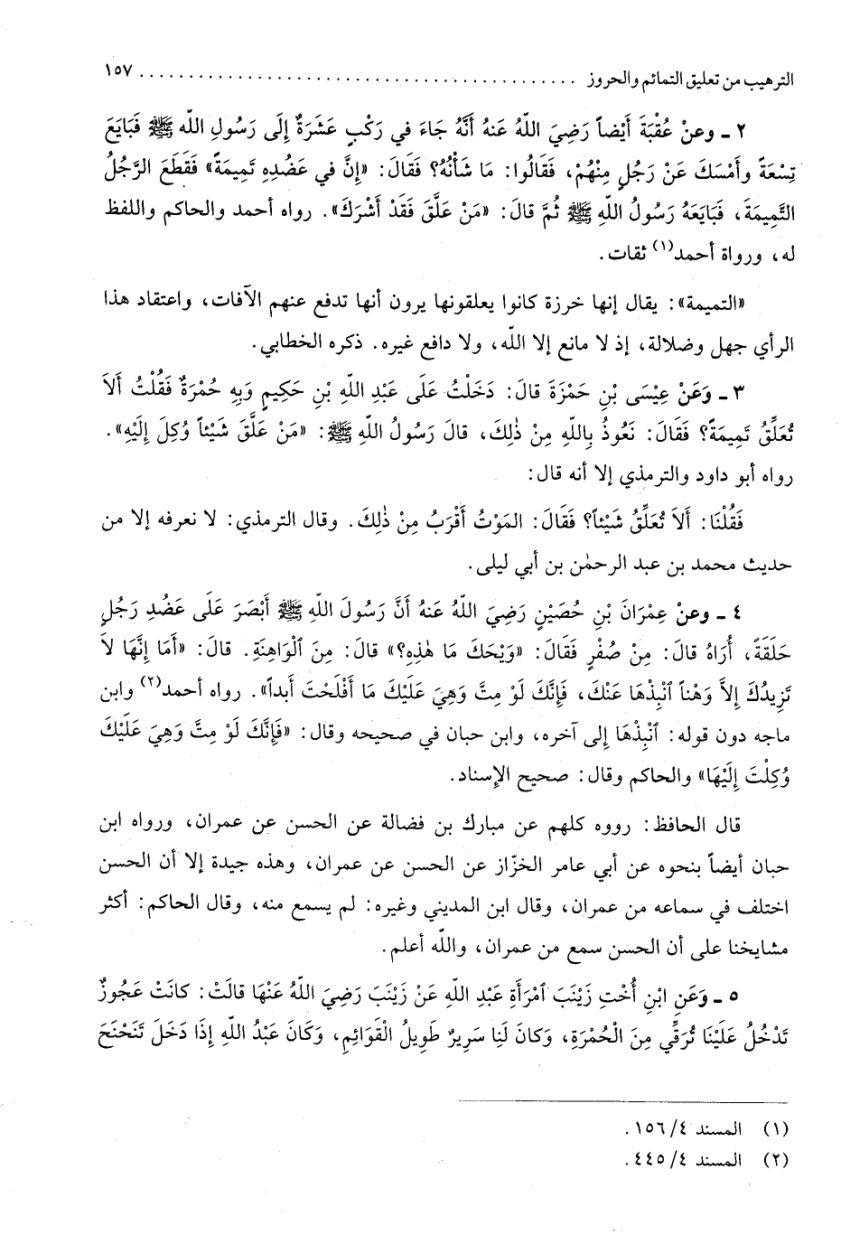 التميمة يُقَال إِنَّهَا خرزة كَانُوا يعلقونها يرَوْنَ أَنَّهَا تدفع عَنْهُم الْآفَات واعتقاد هَذَا الرَّأْي جهل وضلالة إِذْ لَا مَانع إِلَّا الله وَلَا دَافع غَيره