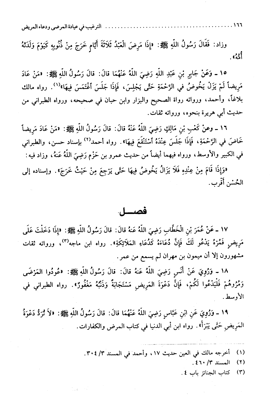 5276 - وَعَن جَابر بن عبد الله رَضِي الله عَنْهُمَا قَالَ قَالَ رَسُول الله صلى الله عَلَيْهِ وَسلم من عَاد مَرِيضا لم يزل يَخُوض فِي الرَّحْمَة حَتَّى يجلس فَإِذا جلس اغتمس فِيهَا
