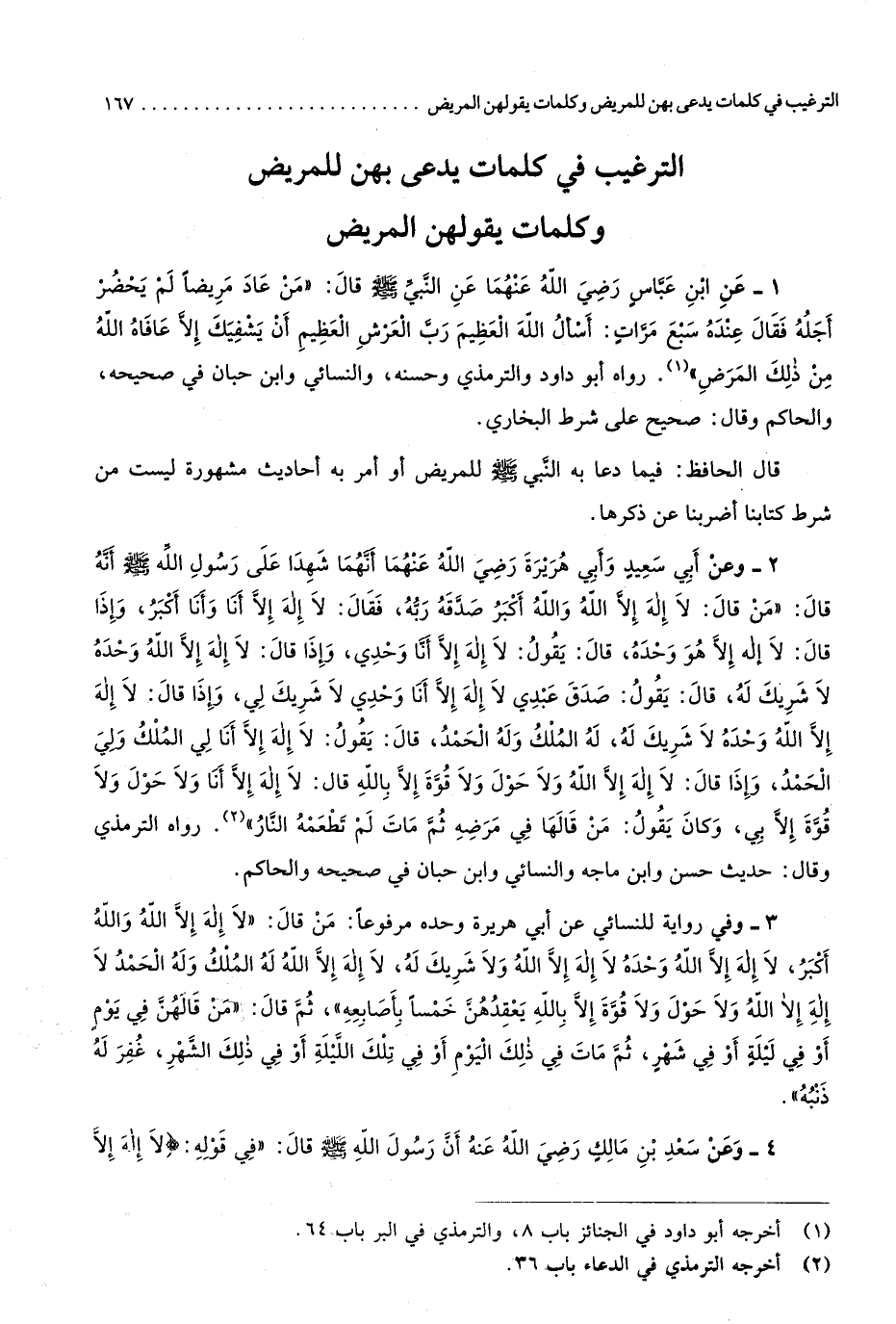 8 - التَّرْغِيب فِي كَلِمَات يدعى بِهن للْمَرِيض وكلمات يقولهن الْمَرِيض