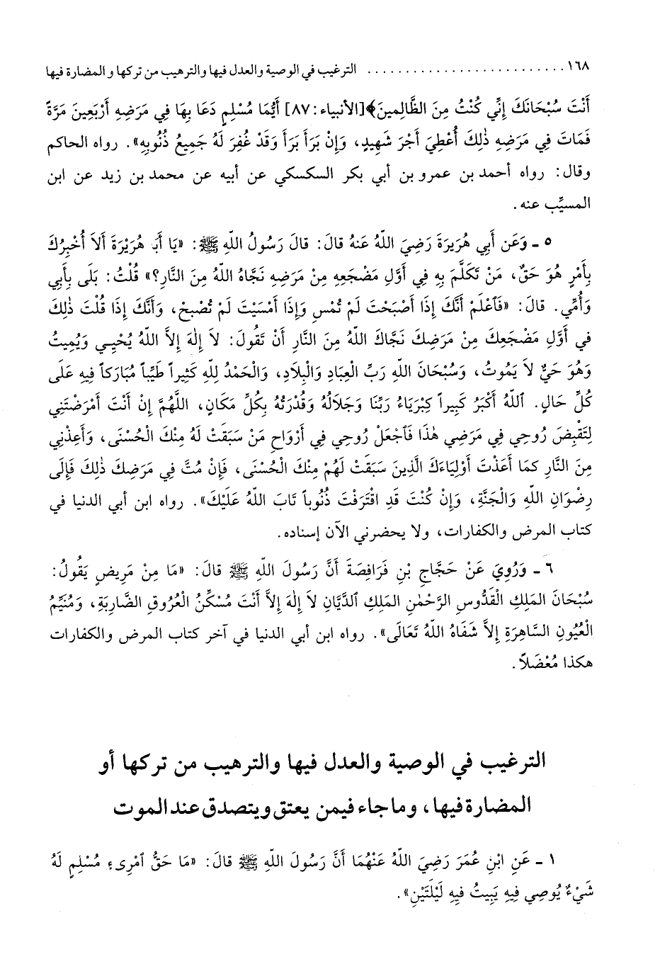 لَا إِلَه إِلَّا أَنْت سُبْحَانَكَ إِنِّي كنت من الظَّالِمين الأنبي 78 أَيّمَا مُسلم دَعَا بهَا فِي مَرضه أَرْبَعِينَ مرّة فَمَاتَ فِي مَرضه ذَلِك أعطي أجر شَهِيد وَإِن برأَ برأَ وَقد غفر لَهُ جَمِيع ذنُوبه