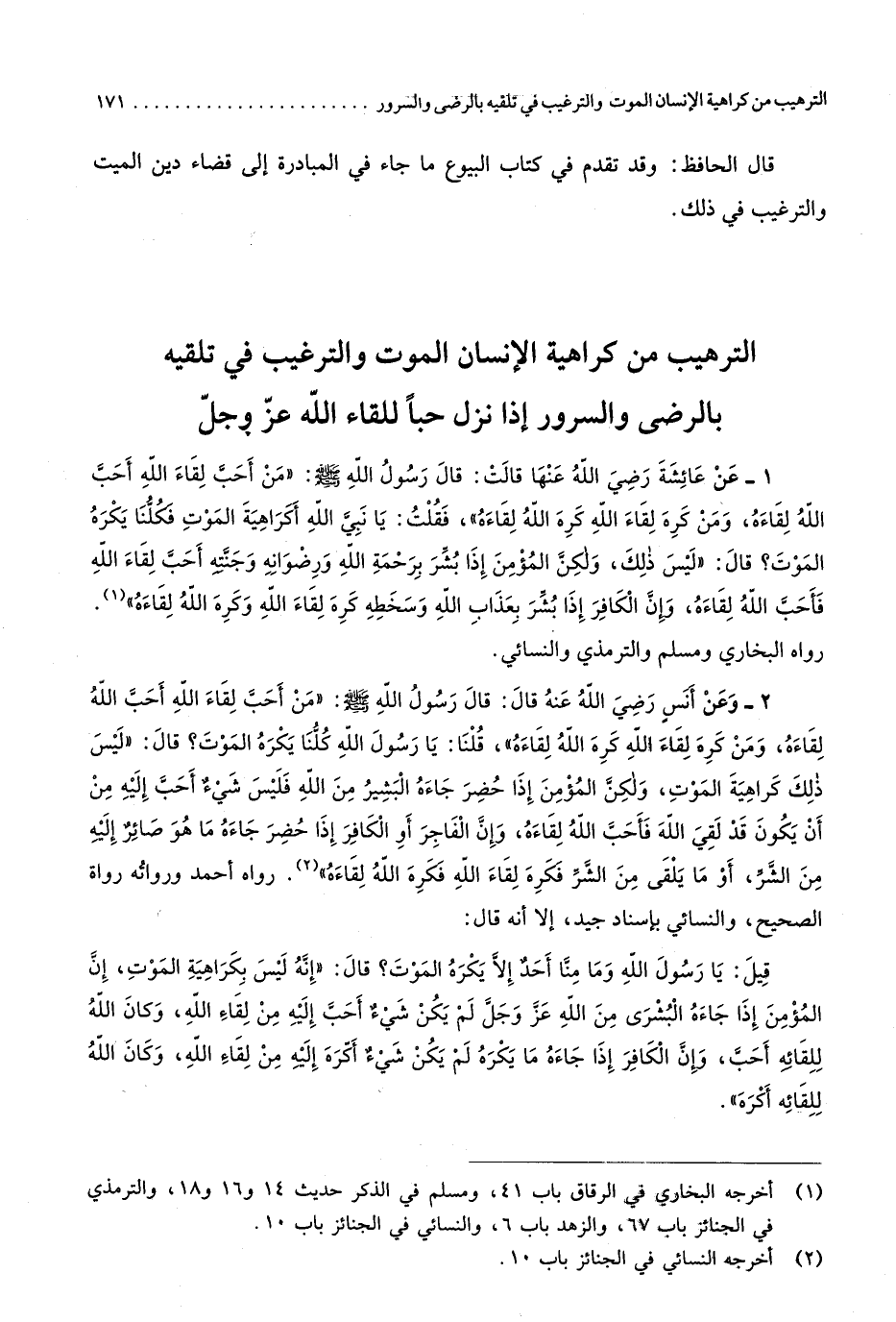 التَّرْهِيب من كَرَاهِيَة الْإِنْسَان الْمَوْت وَالتَّرْغِيب فِي تلقيه بالرضى وَالسُّرُور إِذا نزل حبا للقاء الله عز وَجل