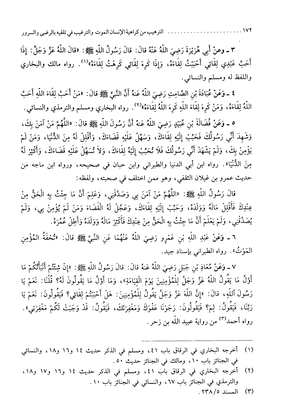 7 - وَعَن معَاذ بن جبل رَضِي الله عَنهُ قَالَ قَالَ رَسُول الله صلى الله عَلَيْهِ وَسلم إِن شِئْتُم أنبأتكم مَا أول مَا يَقُول الله عز وَجل للْمُؤْمِنين يَوْم الْقِيَامَة وَمَا أول مَا يَقُولُونَ لَهُ قُلْنَا نعم يَا رَسُول الله قَالَ إِن الله عز وَجل يَقُول للْمُؤْمِنين هَل أَحْبَبْتُم لقائي فَيَقُولُونَ نعم يَا رَبنَا فَيَقُول لم فَيَقُولُونَ رجونا عفوك ومغفرتك فَيَقُول قد وَجَبت لكم مغفرتي