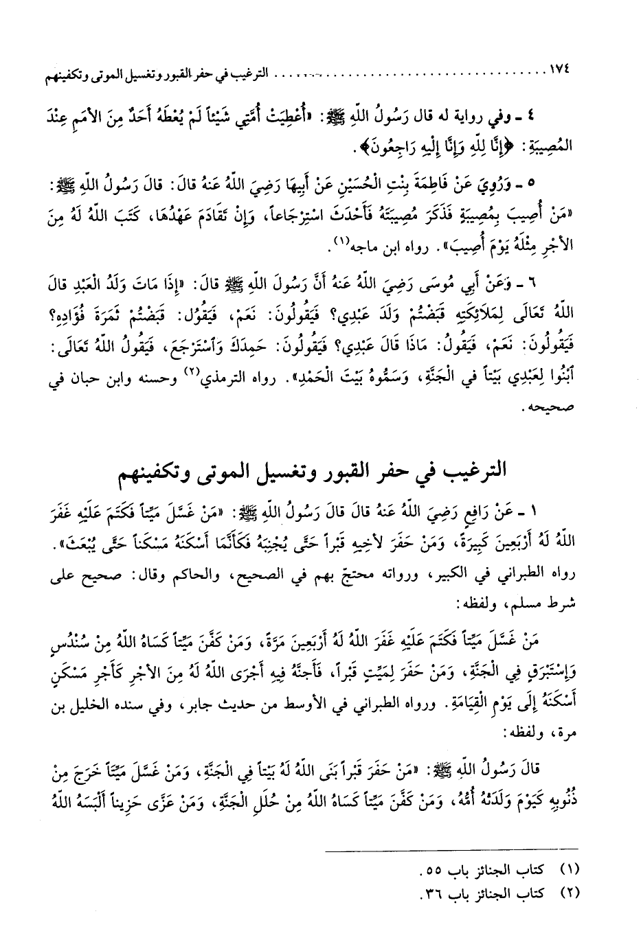5304 - وَعَن أبي مُوسَى رَضِي الله عَنهُ أَن رَسُول الله صلى الله عَلَيْهِ وَسلم قَالَ إِذا مَاتَ ولد العَبْد قَالَ الله تَعَالَى لملائكته قبضتم ولد عَبدِي فَيَقُولُونَ نعم فَيَقُول قبضتم ثَمَرَة فُؤَاده فَيَقُولُونَ نعم فَيَقُول مَاذَا قَالَ عَبدِي فَيَقُولُونَ حمدك واسترجع فَيَقُول الله تَعَالَى ابْنُوا لعبدي بَيْتا فِي الْجنَّة وسموه بَيت الْحَمد
