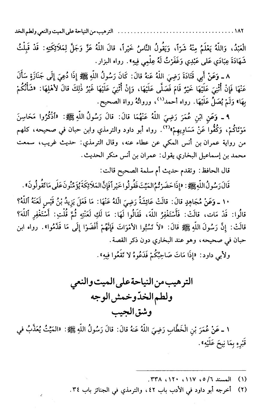 التَّرْهِيب من النِّيَاحَة على الْمَيِّت والنعي وَلَطم الخد وخمش الْوَجْه وشق الجيب