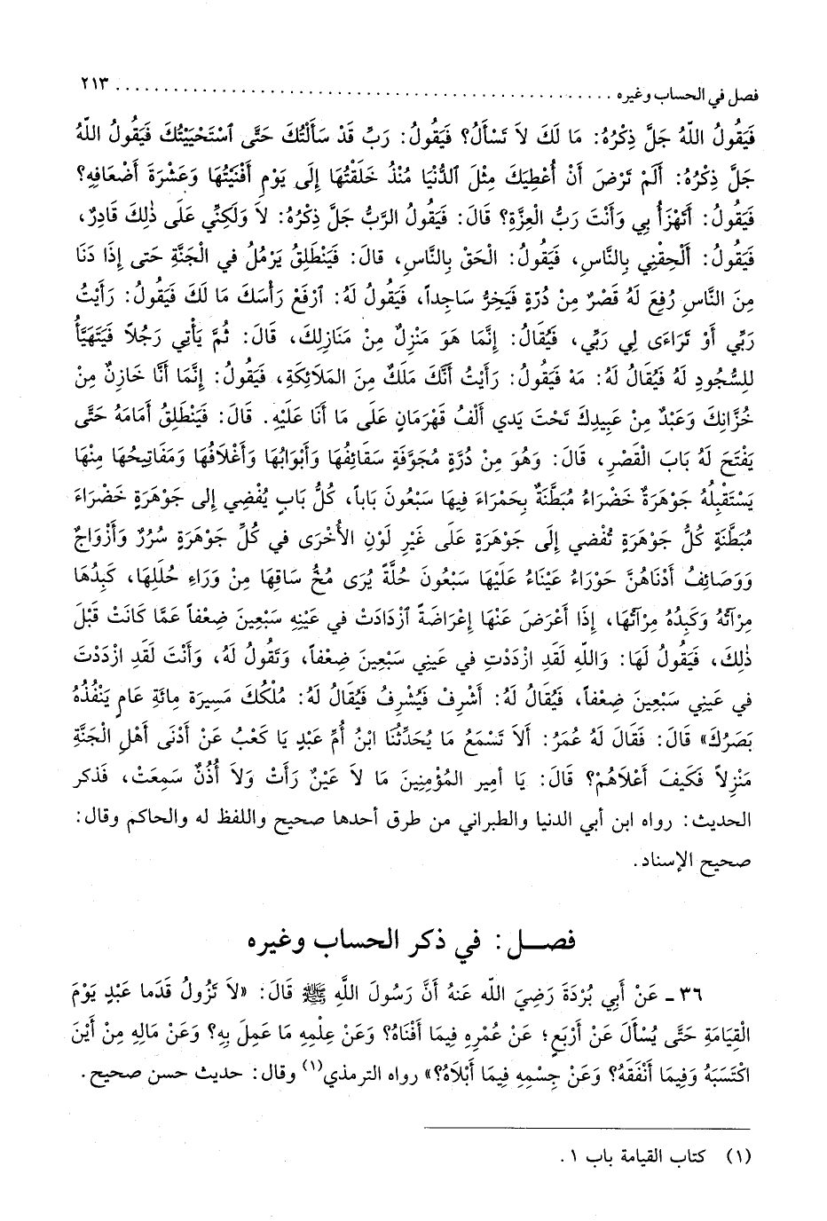 قَالَ فَينْطَلق أَمَامه حَتَّى يفتح لَهُ بَاب الْقصر قَالَ وَهُوَ من درة مجوفة سقائفها وأبوابها وأغلافها ومفاتيحها مِنْهَا يستقبله جَوْهَرَة خضراء مبطنة بِحَمْرَاء فِيهَا سَبْعُونَ بَابا كل بَاب يُفْضِي إِلَى جَوْهَرَة خضراء مبطنة كل جَوْهَرَة تُفْضِي إِلَى جَوْهَرَة على غير لون الْأُخْرَى فِي كل جَوْهَرَة سرر وَأَزْوَاج ووصائف أدناهن حوراء عيناء عَلَيْهَا سَبْعُونَ حلَّة يرى مخ سَاقهَا من وَرَاء حللها كَبِدهَا مرآته وكبده مرآتها إِذا أعرض عَنْهَا إعراضة ازدادت فِي عينه سبعين ضعفا عَمَّا كَانَت قبل ذَلِك فَيَقُول لَهَا وَالله لقد ازددت فِي عَيْني سبعين ضعفا وَتقول لَهُ وَأَنت لقد ازددت فِي عَيْني سبعين ضعفا فَيُقَال لَهُ أشرف فيشرف فَيُقَال لَهُ ملكك مسيرَة مائَة عَام ينفذهُ بَصرك قَالَ فَقَالَ لَهُ عمر أَلا تسمع مَا يحدثنا ابْن أم عبد يَا كَعْب عَن أدنى أهل الْجنَّة منزلا فَكيف أعلاهم قَالَ يَا أَمِير الْمُؤمنِينَ مَا لَا عين رَأَتْ وَلَا أذن سَمِعت فَذكر الحَدِيث رَوَاهُ ابْن أبي الدُّنْيَا وَالطَّبَرَانِيّ من طرق أَحدهَا صَحِيح وَاللَّفْظ لَهُ وَالْحَاكِم وَقَالَ صَحِيح الْإِسْنَاد