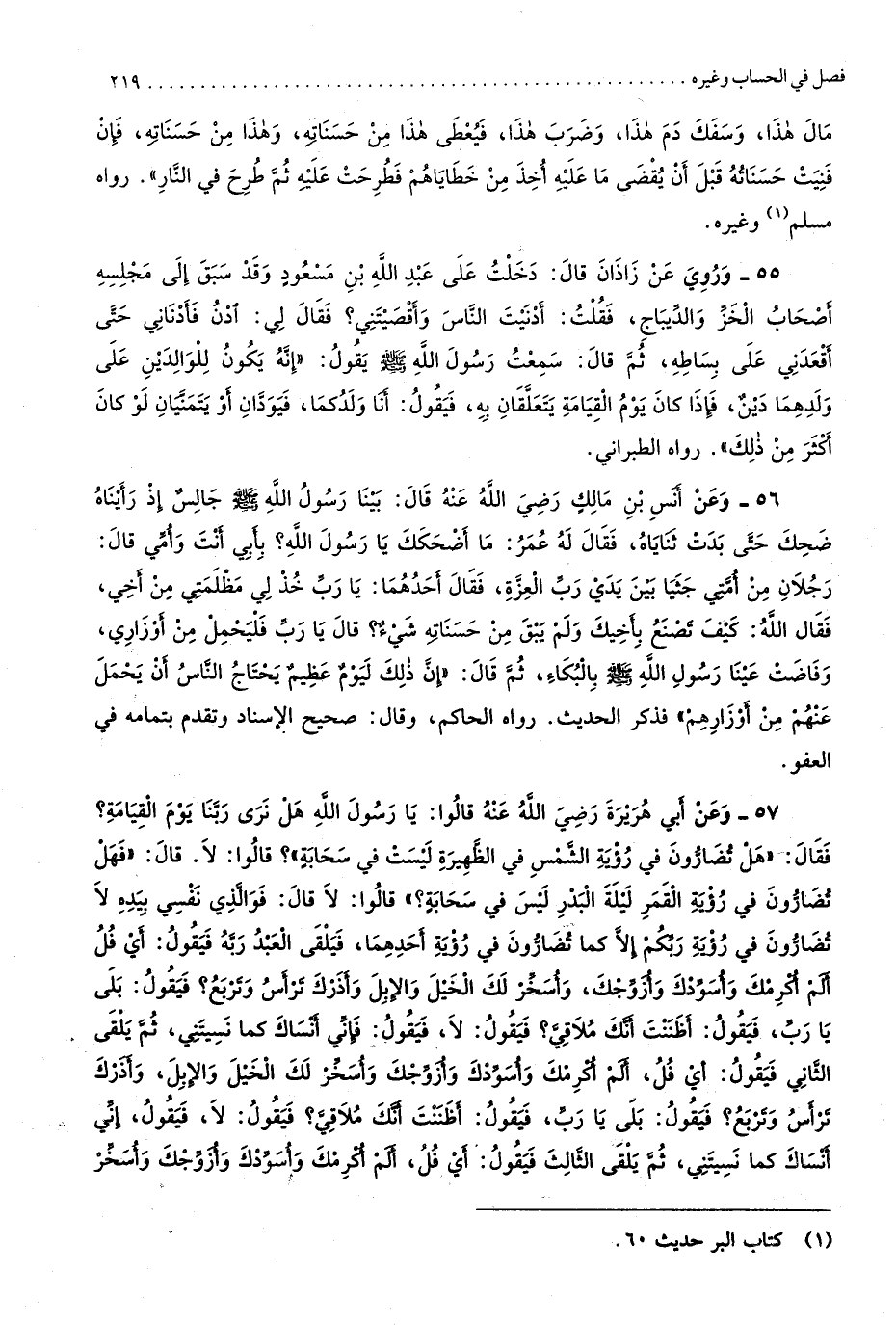 5463 - وَعَن أنس بن مَالك رَضِي الله عَنهُ قَالَ بَينا رَسُول الله صلى الله عَلَيْهِ وَسلم جَالس إِذْ رَأَيْنَاهُ ضحك حَتَّى بَدَت ثناياه فَقَالَ لَهُ عمر مَا أضْحكك يَا رَسُول الله بِأبي أَنْت وَأمي قَالَ رجلَانِ من أمتِي جثيا بَين يَدي رب الْعِزَّة فَقَالَ أَحدهمَا يَا رب خُذ لي مظلمتي من أخي فَقَالَ الله كَيفَ تصنع بأخيك وَلم يبْق من حَسَنَاته شَيْء قَالَ يَا رب فليحمل من أوزاري وفاضت عينا رَسُول الله صلى الله عَلَيْهِ وَسلم بالبكاء ثمَّ قَالَ إِن ذَلِك ليَوْم عَظِيم يحْتَاج النَّاس أَن يحمل عَنْهُم من أوزارهم فَذكر الحَدِيث
