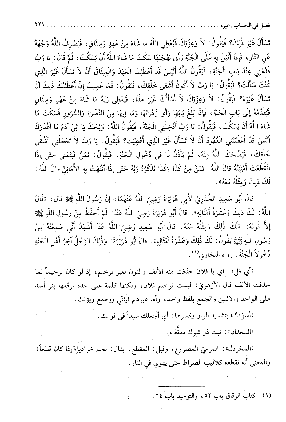 تسْأَل غير ذَلِك فَيَقُول لَا وَعزَّتك فيعطي الله مَا شَاءَ من عهد وميثاق فَيصْرف الله وَجهه عَن النَّار فَإِذا أقبل بِهِ على الْجنَّة رأى بهجتها سكت مَا شَاءَ الله أَن يسكت ثمَّ قَالَ يَا رب قدمني عِنْد بَاب الْجنَّة فَيَقُول الله أَلَيْسَ قد أَعْطَيْت الْعَهْد والميثاق أَن لَا تسْأَل غير الَّذِي كنت سَأَلت فَيَقُول يَا رب لَا أكون أَشْقَى خلقك فَيَقُول فَمَا عَسَيْت إِن أَعطيتك ذَلِك أَن تسْأَل غَيره فَيَقُول لَا وَعزَّتك لَا أَسأَلك غير هَذَا فيعطي ربه مَا شَاءَ من عهد وميثاق فَيقدمهُ إِلَى بَاب الْجنَّة فَإِذا بلغ بَابهَا رأى زهرتها وَمَا فِيهَا من النضرة وَالسُّرُور فَسكت مَا شَاءَ الله أَن يسكت فَيَقُول يَا رب أدخلني الْجنَّة فَيَقُول الله وَيحك يَا ابْن آدم مَا أغدرك أَلَيْسَ قد أَعْطَيْتنِي العهود أَن لَا تسْأَل غير الَّذِي أَعْطَيْت فَيَقُول يَا رب لَا تجعلني أَشْقَى خلقك فيضحك الله مِنْهُ ثمَّ يَأْذَن لَهُ فِي دُخُول الْجنَّة فَيَقُول تمن فيتمنى حَتَّى إِذا انْقَطَعت أمْنِيته قَالَ الله تمن من كَذَا وَكَذَا يذكرهُ ربه حَتَّى إِذا انْتَهَت بِهِ الْأَمَانِي قَالَ الله لَك ذَلِك وَمثله مَعَه