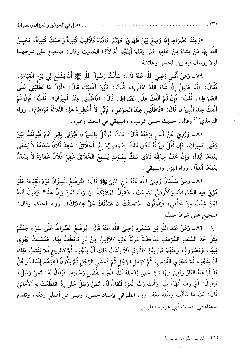 وَعند الصِّرَاط إِذا وضع بَين ظَهْري جَهَنَّم حافتاه كلاليب كَثِيرَة وحسك كَثِيرَة يحبس الله بهَا من يَشَاء من خلقه حَتَّى يعلم أينجو أم لَا الحَدِيث وَقَالَ صَحِيح على شَرطهمَا لَوْلَا إرْسَال فِيهِ بَين الْحسن وَعَائِشَة