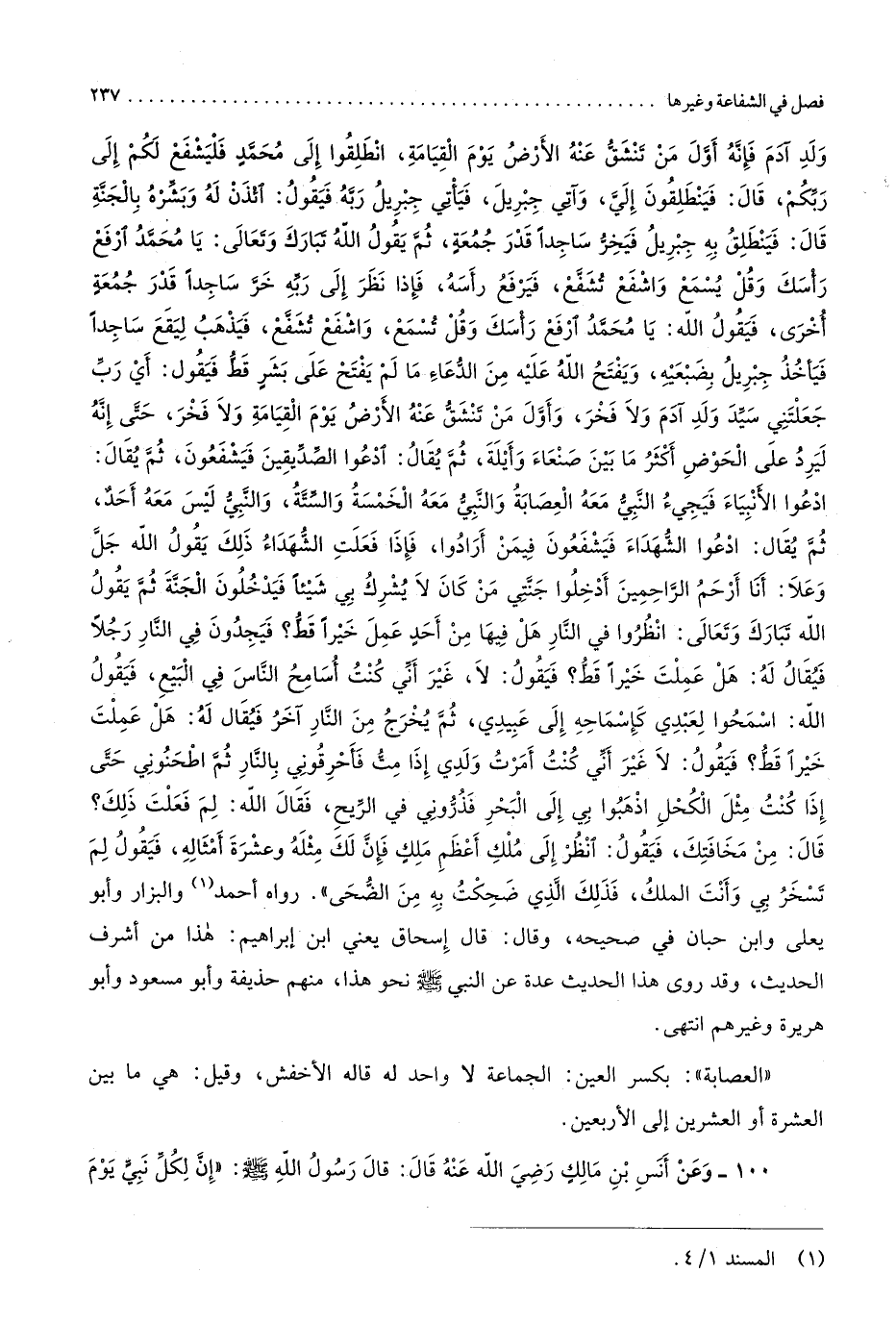 ولد آدم فَإِنَّهُ أول من تَنْشَق عَنهُ الأَرْض يَوْم الْقِيَامَة انْطَلقُوا إِلَى مُحَمَّد فليشفع لكم إِلَى ربكُم قَالَ فَيَنْطَلِقُونَ إِلَيّ وَآتِي جِبْرِيل فَيَأْتِي جِبْرِيل ربه فَيَقُول ائْذَنْ لَهُ وبشره بِالْجنَّةِ قَالَ فَينْطَلق بِهِ جِبْرِيل فيخر سَاجِدا قدر جُمُعَة ثمَّ يَقُول الله تبَارك وَتَعَالَى يَا مُحَمَّد ارْفَعْ رَأسك وَقل يسمع وَاشْفَعْ تشفع فيرفع رَأسه فَإِذا نظر إِلَى ربه خر سَاجِدا قدر جُمُعَة أُخْرَى فَيَقُول الله يَا مُحَمَّد ارْفَعْ رَأسك وَقل تسمع وَاشْفَعْ تشفع فَيذْهب ليَقَع سَاجِدا فَيَأْخُذ جِبْرِيل بضبعيه وَيفتح الله عَلَيْهِ من الدُّعَاء مَا لم يفتح على بشر قطّ فَيَقُول أَي رب جَعَلتني سيد ولد آدم وَلَا فَخر وَأول من تَنْشَق عَنهُ الأَرْض يَوْم الْقِيَامَة وَلَا فَخر حَتَّى إِنَّه ليرد على الْحَوْض أَكثر مَا بَين صنعاء وأيلة ثمَّ يُقَال ادعوا الصديقين فيشفعون ثمَّ يُقَال ادعوا الْأَنْبِيَاء فَيَجِيء النَّبِي مَعَه الْعِصَابَة وَالنَّبِيّ مَعَه الْخَمْسَة والستة وَالنَّبِيّ لَيْسَ مَعَه أحد ثمَّ يُقَال ادعوا الشُّهَدَاء فيشفعون فِيمَن أَرَادوا فَإِذا فعلت الشُّهَدَاء ذَلِك يَقُول الله جلّ وَعلا أَنا أرْحم الرَّاحِمِينَ أدخلُوا جنتي من كَانَ لَا يُشْرك بِي شَيْئا فَيدْخلُونَ الْجنَّة ثمَّ يَقُول الله تبَارك وَتَعَالَى انْظُرُوا فِي النَّار هَل فِيهَا من أحد عمل خيرا قطّ فيجدون فِي النَّار رجلا فَيُقَال لَهُ هَل عملت خيرا قطّ فَيَقُول لَا غير أَنِّي كنت أسامح النَّاس فِي البيع فَيَقُول الله اسمحوا لعبدي كإسماحه إِلَى عَبِيدِي ثمَّ يخرج من النَّار آخر فَيُقَال لَهُ هَل عملت خيرا قطّ فَيَقُول لَا غير أَنِّي كنت أمرت وَلَدي إِذا مت فأحرقوني بالنَّار ثمَّ اطحنوني حَتَّى إِذا كنت مثل الْكحل اذْهَبُوا بِي إِلَى الْبَحْر فذروني فِي الرّيح فَقَالَ الله لم فعلت ذَلِك قَالَ من مخافتك فَيَقُول انْظُر إِلَى ملك أعظم ملك فَإِن لَك مثله وَعشرَة أَمْثَاله فَيَقُول لم تسخر بِي وَأَنت الْملك فَذَلِك الَّذِي ضحِكت بِهِ من الضُّحَى