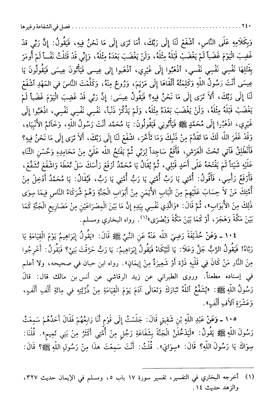 وبكلامه على النَّاس شفع لنا إِلَى رَبك أما ترى إِلَى مَا نَحن فِيهِ فَيَقُول إِن رَبِّي قد غضب الْيَوْم غَضبا لم يغْضب قبله مثله وَلنْ يغْضب بعده مثله وَإِنِّي قد قتلت نفسا لم أومر بقتلها نَفسِي نَفسِي نَفسِي ذَهَبُوا إِلَى غَيْرِي ذَهَبُوا إِلَى عِيسَى فَيَأْتُونَ عِيسَى فَيَقُولُونَ يَا عِيسَى أَنْت رَسُول الله وكلمته أَلْقَاهَا إِلَى مَرْيَم وروح مِنْهُ وَكلمت النَّاس فِي المهد شفع لنا إِلَى رَبك أَلا ترى إِلَى مَا نَحن فِيهِ فَيَقُول عِيسَى إِن رَبِّي قد غضب الْيَوْم غَضبا لم يغْضب قبله مثله وَلنْ يغْضب بعده مثله وَلم يذكر ذَنبا نَفسِي نَفسِي نَفسِي اذْهَبُوا إِلَى غَيْرِي اذْهَبُوا إِلَى مُحَمَّد فَيَأْتُوني فَيَقُولُونَ يَا مُحَمَّد أَنْت رَسُول الله وَخَاتم الْأَنْبِيَاء وَقد غفر الله لَك مَا تقدم من ذَنْبك وَمَا تَأَخّر اشفع لنا إِلَى رَبك أَلا ترى إِلَى مَا نَحن فِيهِ فأنطلق فَآتي تَحت الْعَرْش فأقع سَاجِدا لرَبي ثمَّ يفتح الله عَليّ من محامده وَحسن الثَّنَاء عَلَيْهِ شَيْئا لم يَفْتَحهُ على أحد قبلي ثمَّ يُقَال يَا مُحَمَّد رفع رَأسك سل تعطه وَاشْفَعْ تشفع فأرفع رَأْسِي فَأَقُول أمتِي يَا رب أمتِي يَا رب أمتِي يَا رب فَيُقَال يَا مُحَمَّد أَدخل من أمتك من لَا حِسَاب عَلَيْهِم من الْبَاب الْأَيْمن من أَبْوَاب الْجنَّة وهم شُرَكَاء النَّاس فِيمَا سوى ذَلِك من الْأَبْوَاب ثمَّ قَالَ وَالَّذِي نَفسِي بِيَدِهِ إِن مَا بَين المصراعين من مصاريع الْجنَّة كَمَا بَين مَكَّة وهجر أَو كَمَا بَين مَكَّة وَبصرى