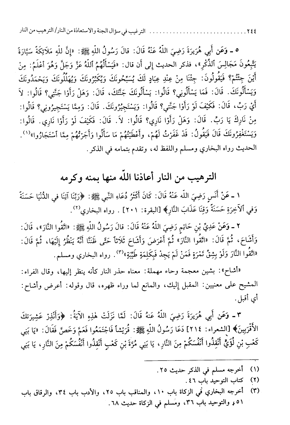 5525 - وَعَن عدي بن حَاتِم رَضِي الله عَنهُ قَالَ قَالَ رَسُول الله صلى الله عَلَيْهِ وَسلم اتَّقوا النَّار قَالَ وأشاح ثمَّ قَالَ اتَّقوا النَّار ثمَّ أعرض وأشاح ثَلَاثًا حَتَّى ظننا أَنه ينظر إِلَيْهَا ثمَّ قَالَ اتَّقوا النَّار وَلَو بشق تَمْرَة فَمن لم يجد فبكلمة طيبَة