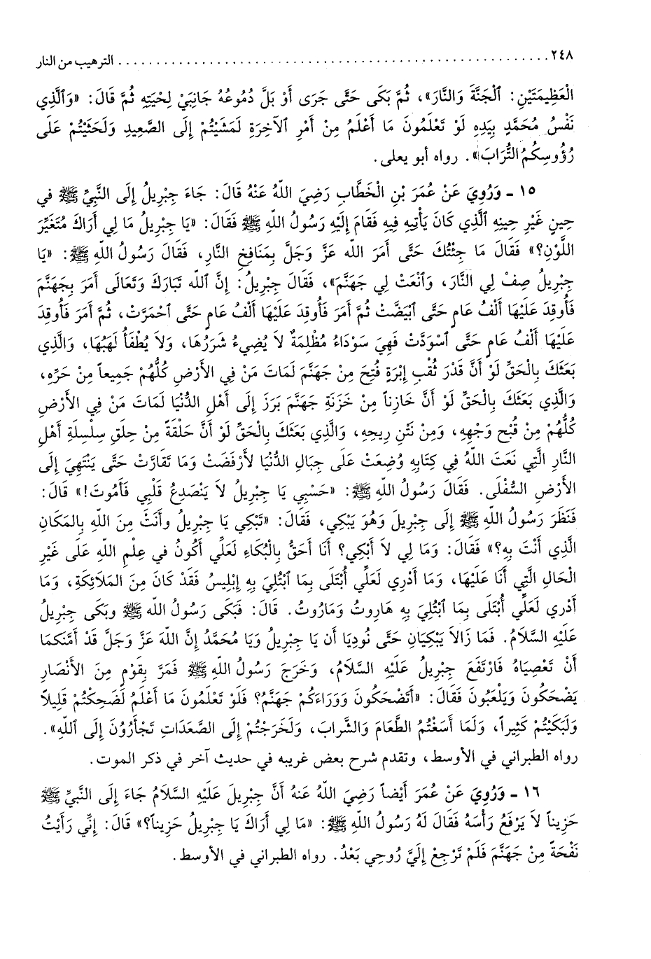 5538 - وَرُوِيَ عَن عمر بن الْخطاب رَضِي الله عَنهُ قَالَ جَاءَ جِبْرِيل إِلَى النَّبِي صلى الله عَلَيْهِ وَسلم فِي حِين غير حِينه الَّذِي كَانَ يَأْتِيهِ فِيهِ فَقَامَ إِلَيْهِ رَسُول الله صلى الله عَلَيْهِ وَسلم فَقَالَ يَا جِبْرِيل مَا لي أَرَاك متغير اللَّوْن فَقَالَ مَا جئْتُك حَتَّى أَمر الله عز وَجل بمنافخ النَّار فَقَالَ رَسُول الله صلى الله عَلَيْهِ وَسلم يَا جِبْرِيل صف لي النَّار وانعت لي جَهَنَّم فَقَالَ جِبْرِيل إِن الله تبَارك وَتَعَالَى أَمر بجهنم فَأوقد عَلَيْهَا ألف عَام حَتَّى ابْيَضَّتْ ثمَّ أَمر فَأوقد عَلَيْهَا ألف عَام حَتَّى احْمَرَّتْ ثمَّ أَمر فَأوقد عَلَيْهَا ألف عَام حَتَّى اسودت فَهِيَ سَوْدَاء مظْلمَة لَا يضيء شررها وَلَا يطفأ لهبها وَالَّذِي بَعثك بِالْحَقِّ لَو أَن قدر ثقب إبرة فتح من جَهَنَّم لمات من فِي الأَرْض كلهم جَمِيعًا من حره وَالَّذِي بَعثك بِالْحَقِّ لَو أَن خَازِنًا من خَزَنَة جَهَنَّم برز إِلَى أهل الدُّنْيَا لمات من فِي الأَرْض كلهم من قبح وَجهه وَمن نَتن رِيحه وَالَّذِي بَعثك بِالْحَقِّ لَو أَن حَلقَة من حلق سلسلة أهل النَّار الَّتِي نعت الله فِي كِتَابه وضعت على جبال الدُّنْيَا لأرفضت وَمَا تقارت حَتَّى يَنْتَهِي إِلَى الأَرْض السُّفْلى