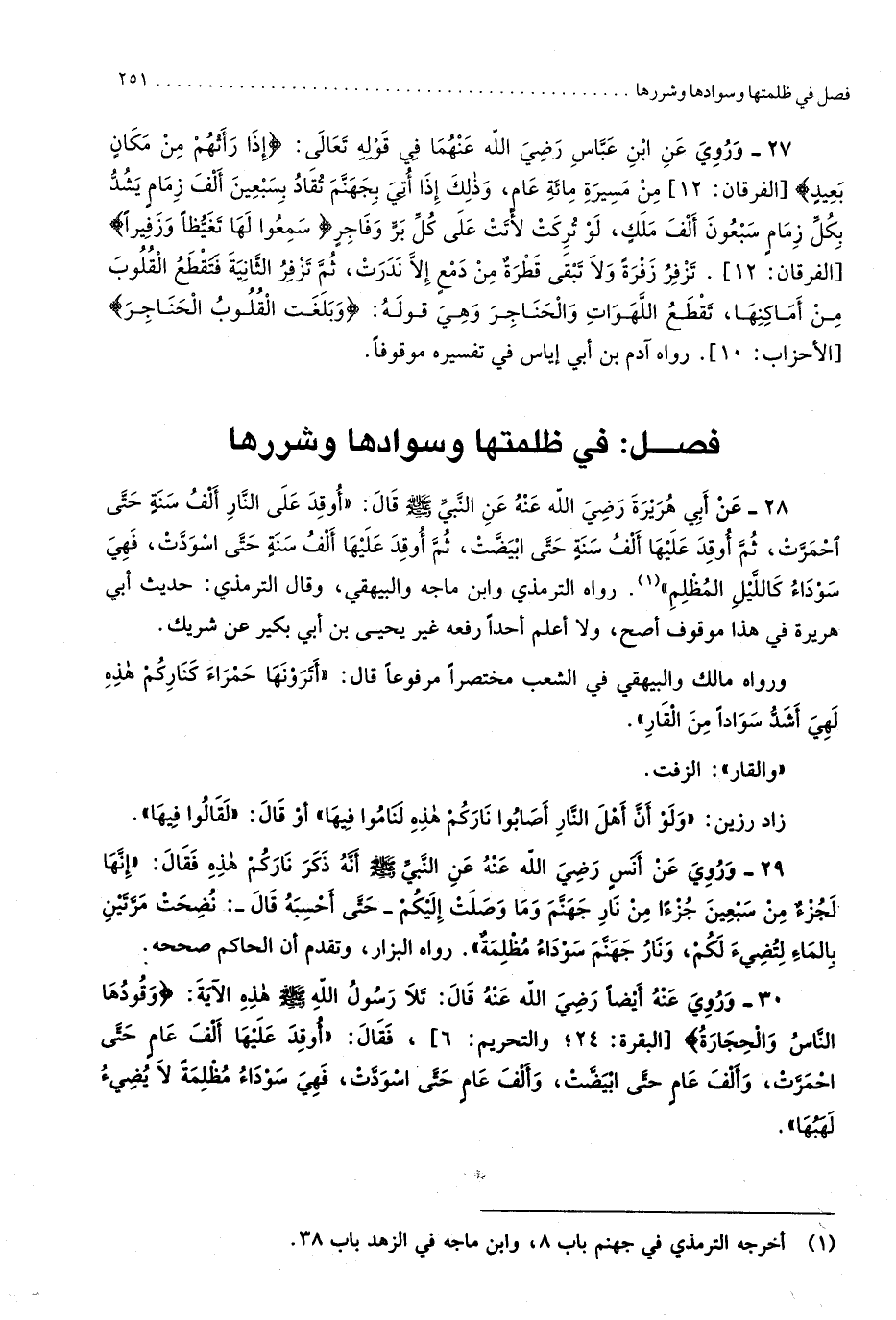 5553 - وَرُوِيَ عَنهُ أَيْضا رَضِي الله عَنهُ قَالَ تَلا رَسُول الله صلى الله عَلَيْهِ وَسلم هَذِه الْآيَة وقودها النَّاس وَالْحِجَارَة الْبَقَرَة 42 وَالتَّحْرِيم 6 فَقَالَ أوقد عَلَيْهَا ألف عَام حَتَّى احْمَرَّتْ وَألف عَام حَتَّى ابْيَضَّتْ وَألف عَام حَتَّى اسودت فَهِيَ سَوْدَاء مظْلمَة لَا يضيء لهبها