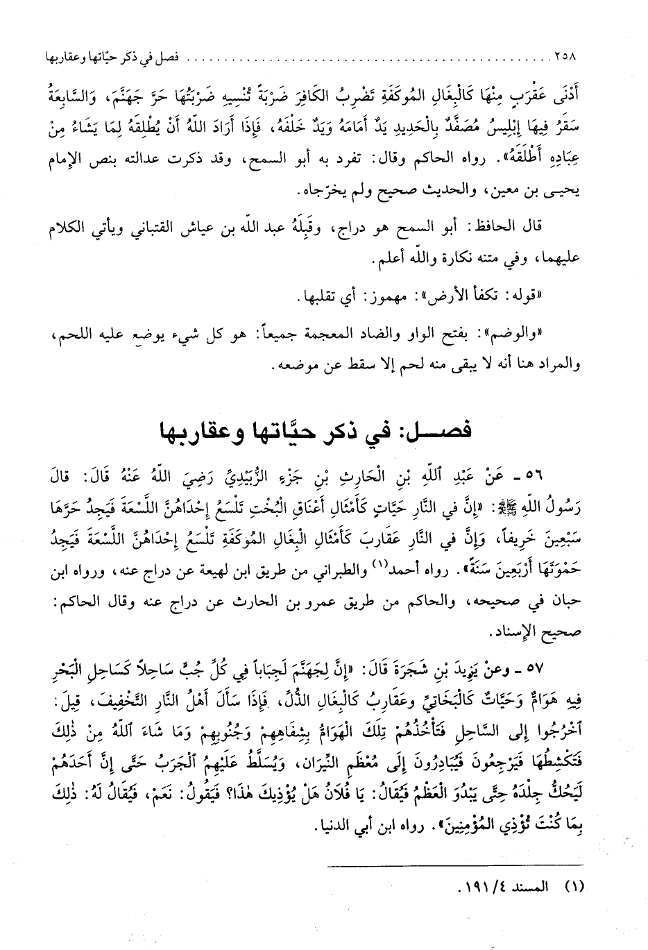 5579 - عَن عبد الله بن الْحَارِث بن جُزْء الزبيدِيّ رَضِي الله عَنهُ قَالَ قَالَ رَسُول الله صلى الله عَلَيْهِ وَسلم إِن فِي النَّار حيات كأمثال أَعْنَاق البخت تلسع إِحْدَاهُنَّ اللسعة فيجد حرهَا سبعين خَرِيفًا وَإِن فِي النَّار عقارب كأمثال البغال الموكفة تلسع إِحْدَاهُنَّ اللسعة فيجد حموتها أَرْبَعِينَ سنة