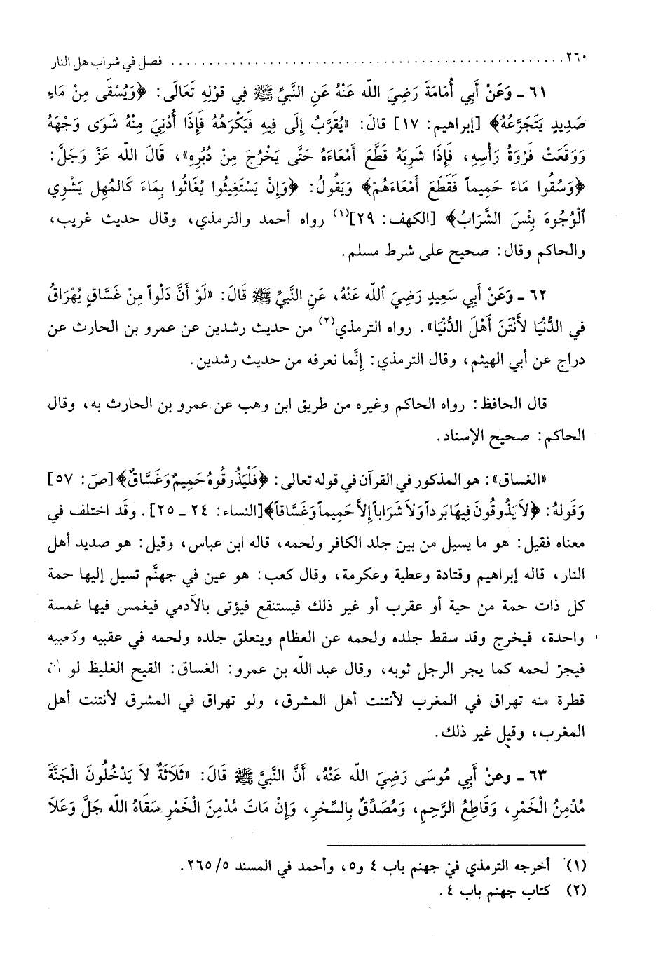 5584 - وَعَن أبي أُمَامَة رَضِي الله عَنهُ عَن النَّبِي صلى الله عَلَيْهِ وَسلم فَقطع أمعاءهم وَيَقُول وَإِن يستغيثوا يغاثوا بِمَاء كَالْمهْلِ يشوي الْوُجُوه بئس الشَّرَاب الْكَهْف 92 رَوَاهُ أَحْمد وَالتِّرْمِذِيّ وَقَالَ حَدِيث غَرِيب وَالْحَاكِم وَقَالَ صَحِيح على شَرط مُسلم