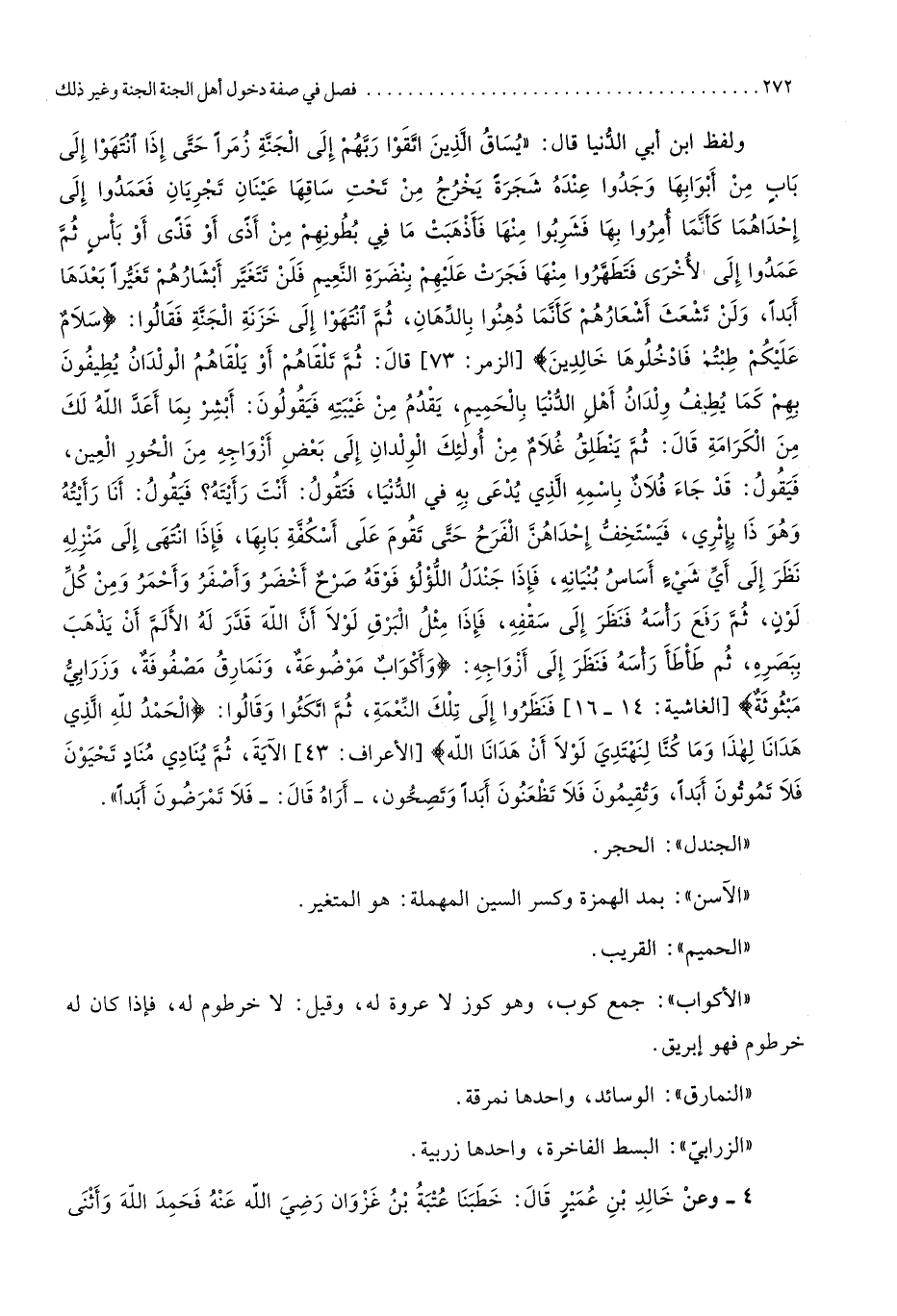 وَلَفظ ابْن أبي الدُّنْيَا قَالَ يساق الَّذين اتَّقوا رَبهم إِلَى الْجنَّة زمرا حَتَّى إِذا انْتَهوا إِلَى بَاب من أَبْوَابهَا وجدوا عِنْده شَجَرَة يخرج من تَحت سَاقهَا عينان تجريان فعمدوا إِلَى إِحْدَاهمَا كَأَنَّمَا أمروا بهَا فَشَرِبُوا مِنْهَا فأذهبت مَا فِي بطونهم من أَذَى أَو قذى أَو بَأْس ثمَّ عَمدُوا إِلَى الْأُخْرَى فتطهروا مِنْهَا فجرت عَلَيْهِم بنضرة النَّعيم فَلَنْ تَتَغَيَّر أبشارهم تغيرا بعْدهَا أبدا وَلنْ تشعث أشعارهم كَأَنَّمَا دهنوا بالدهان ثمَّ انْتَهوا إِلَى خَزَنَة الْجنَّة فَقَالُوا سَلام عَلَيْكُم طبتم فادخلوها خَالِدين الزمر 37 قَالَ ثمَّ تلقاهم أَو يلقاهم الْولدَان يطيفون بهم كَمَا يطِيف ولدان أهل الدُّنْيَا بالحميم يقدم من غيبته فَيَقُولُونَ أبشر بِمَا أعد الله لَك من الْكَرَامَة قَالَ ثمَّ ينْطَلق غُلَام من أُولَئِكَ الْولدَان إِلَى بعض أَزوَاجه من الْحور الْعين فَيَقُول قد جَاءَ فلَان باسمه الَّذِي يدعى بِهِ فِي الدُّنْيَا فَتَقول أَنْت رَأَيْته فَيَقُول أَنا رَأَيْته وَهُوَ ذَا بإثري فيستخف إِحْدَاهُنَّ الْفَرح حَتَّى تقوم على أُسْكُفَّة بَابهَا فَإِذا انْتهى إِلَى منزله نظر إِلَى أَي شَيْء أساس بُنْيَانه فَإِذا جندل اللُّؤْلُؤ فَوْقه صرح أَخْضَر وأصفر وأحمر وَمن كل لون ثمَّ رفع رَأسه فَنظر إِلَى سقفه فَإِذا مثل الْبَرْق لَوْلَا أَن الله قدر لَهُ الْأَلَم أَن يذهب ببصره ثمَّ طأطأ رَأسه فَنظر إِلَى أَزوَاجه وأكواب مَوْضُوعَة ونمارق مصفوفة وزرابي مبثوثة الغاشية 41 61 فنظروا إِلَى تِلْكَ النِّعْمَة ثمَّ اتكئوا وَقَالُوا الْحَمد لله الَّذِي هدَانَا لهَذَا وَمَا كُنَّا لنهتدي لَوْلَا أَن هدَانَا الله الْأَعْرَاف 34 الْآيَة ثمَّ يُنَادي مُنَاد تحيون فَلَا تموتون أبدا وتقيمون فَلَا تظعنون أبدا وتصحون أرَاهُ قَالَ فَلَا تمرضون أبدا